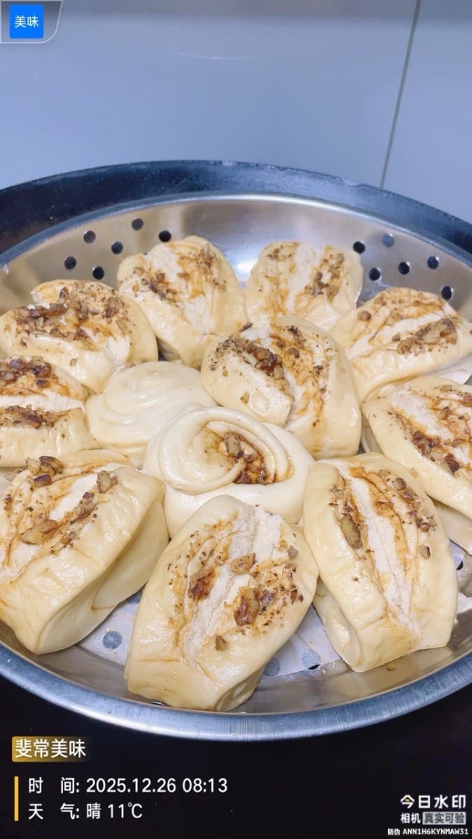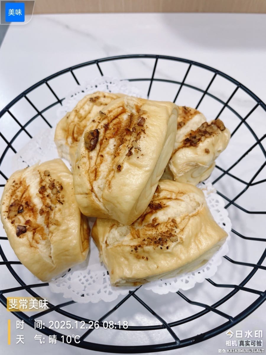 ¡Estos bollitos de nueces y azúcar moreno recién hechos al vapor son absolutamente increíbles! Al abrir la tapa, el dulce aroma del azúcar moreno, combinado con el aroma a nuez, te llena la nariz. Son suaves pero increíblemente masticables; si los aprietas, recuperan su forma al instante. El sabor a trigo de los bollitos se fusiona con la sutil dulzura del azúcar moreno, y las nueces al vapor se vuelven fragantes, suaves y cremosas, integrándose a la perfección con la textura masticable de los bollitos. Cada bocado es más delicioso que el anterior; ¡fácilmente podrías comer tres sin querer más!