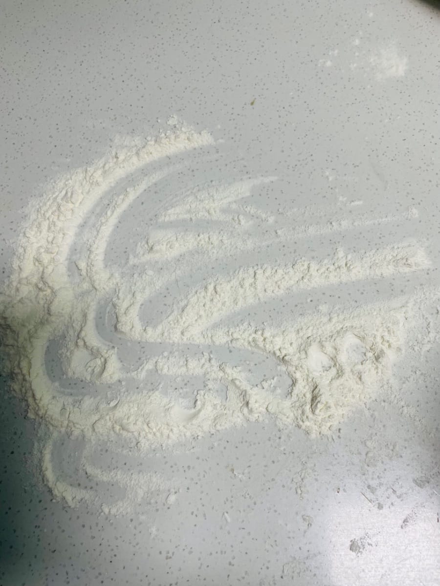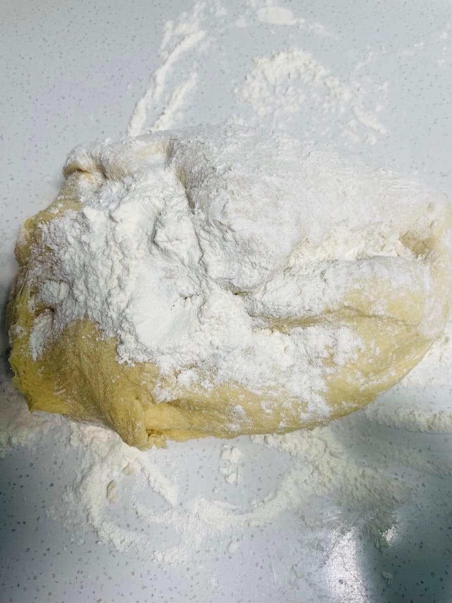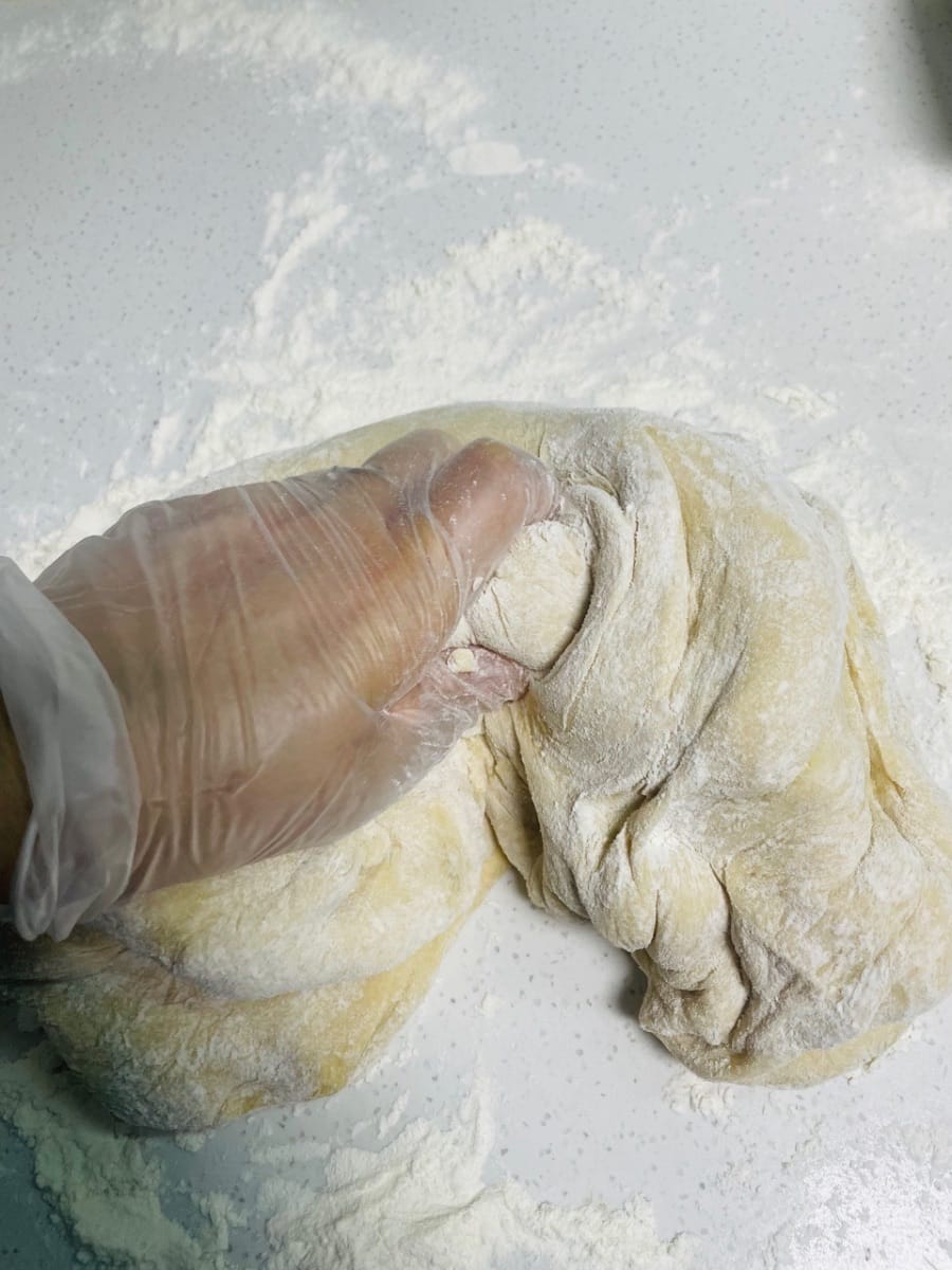 - Espolvorea harina seca sobre la superficie de trabajo, retira la masa levada, añade un poco más de harina y amásala hasta que puedas abrirla con un cuchillo y no veas ningún agujero de aire visible en los lados. ¡Este paso es clave para una superficie lisa para los bollos al vapor!