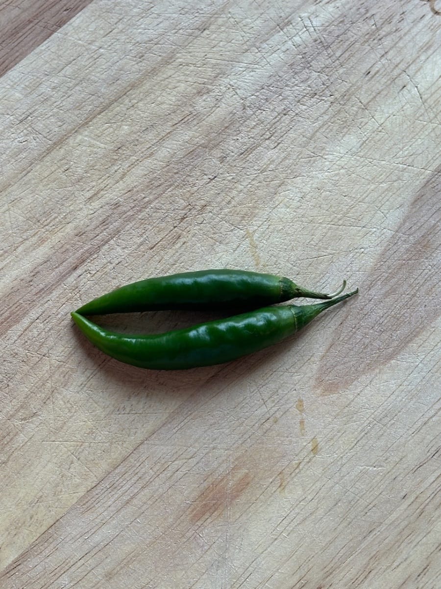 Agregue chiles rojos y verdes, cebolla, raíces de cilantro, hojas de menta y ajo en un molinillo.