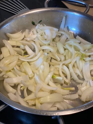- Ponga 1 cucharada de aceite en una sartén a fuego medio alto y agregue la cebolla en rodajas.