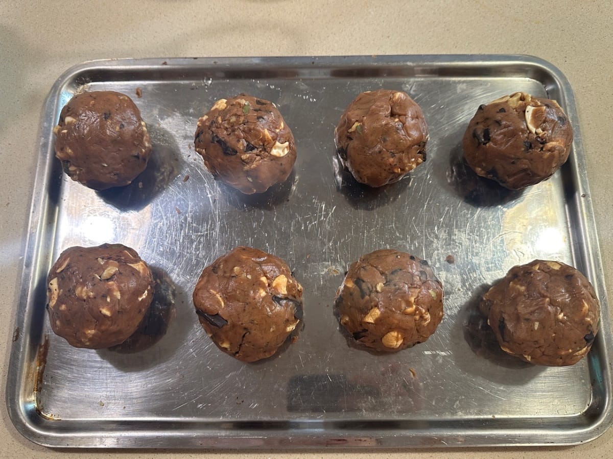 - Después de eso, enrolle la masa en 8 masas pequeñas iguales (cada una de mis masas pesa aproximadamente 137 g)