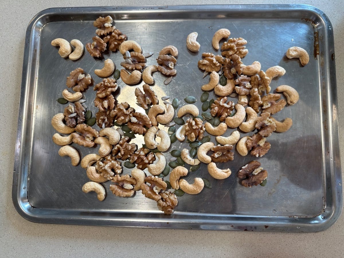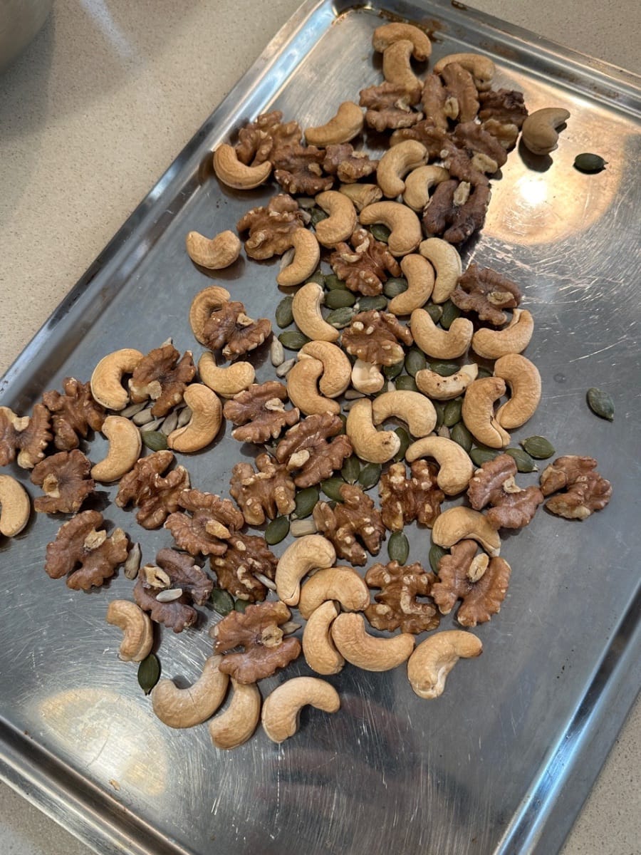 - Comenzamos tostando los frutos secos variados en el horno a 170 °C durante unos 8 minutos.