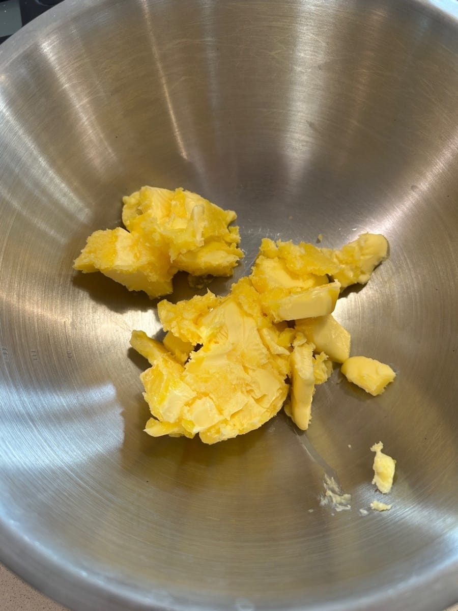 - En un tazón grande, agregue la mantequilla ablandada (para probar si la mantequilla está lo suficientemente suave, si puede presionar un dedo sobre la mantequilla muy fácilmente, entonces está lista)
