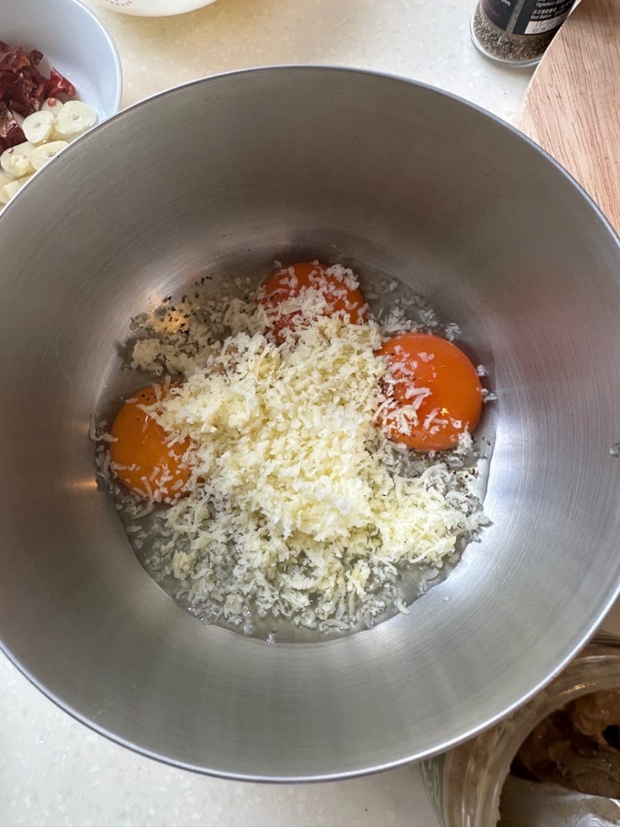 - Comienza preparando la salsa para pasta. En un tazón grande, mezcla los huevos, la pimienta negra, el queso rallado y la mantequilla de pistacho hasta que estén bien integrados.