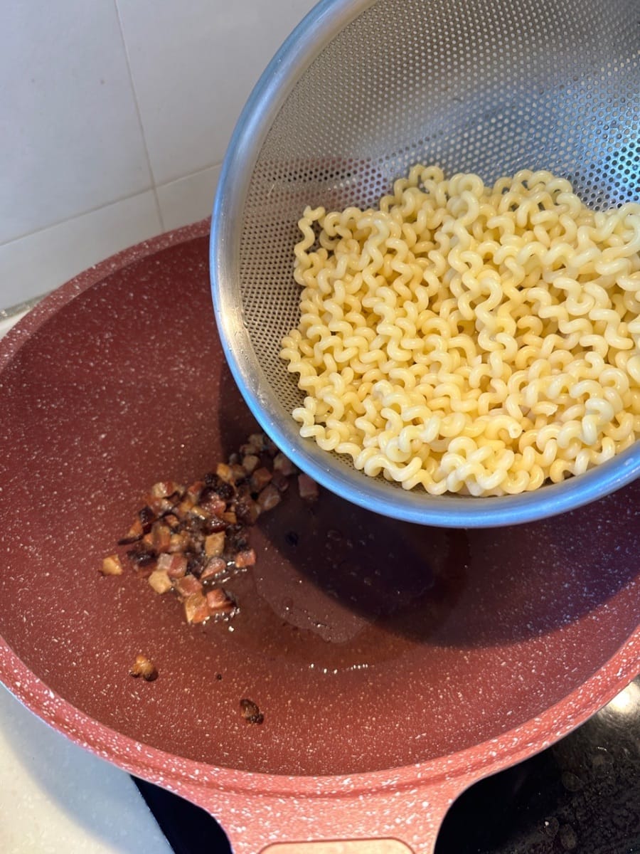 - Apagar el fuego, echar la pasta para que quede cubierta con el aceite de tocino.