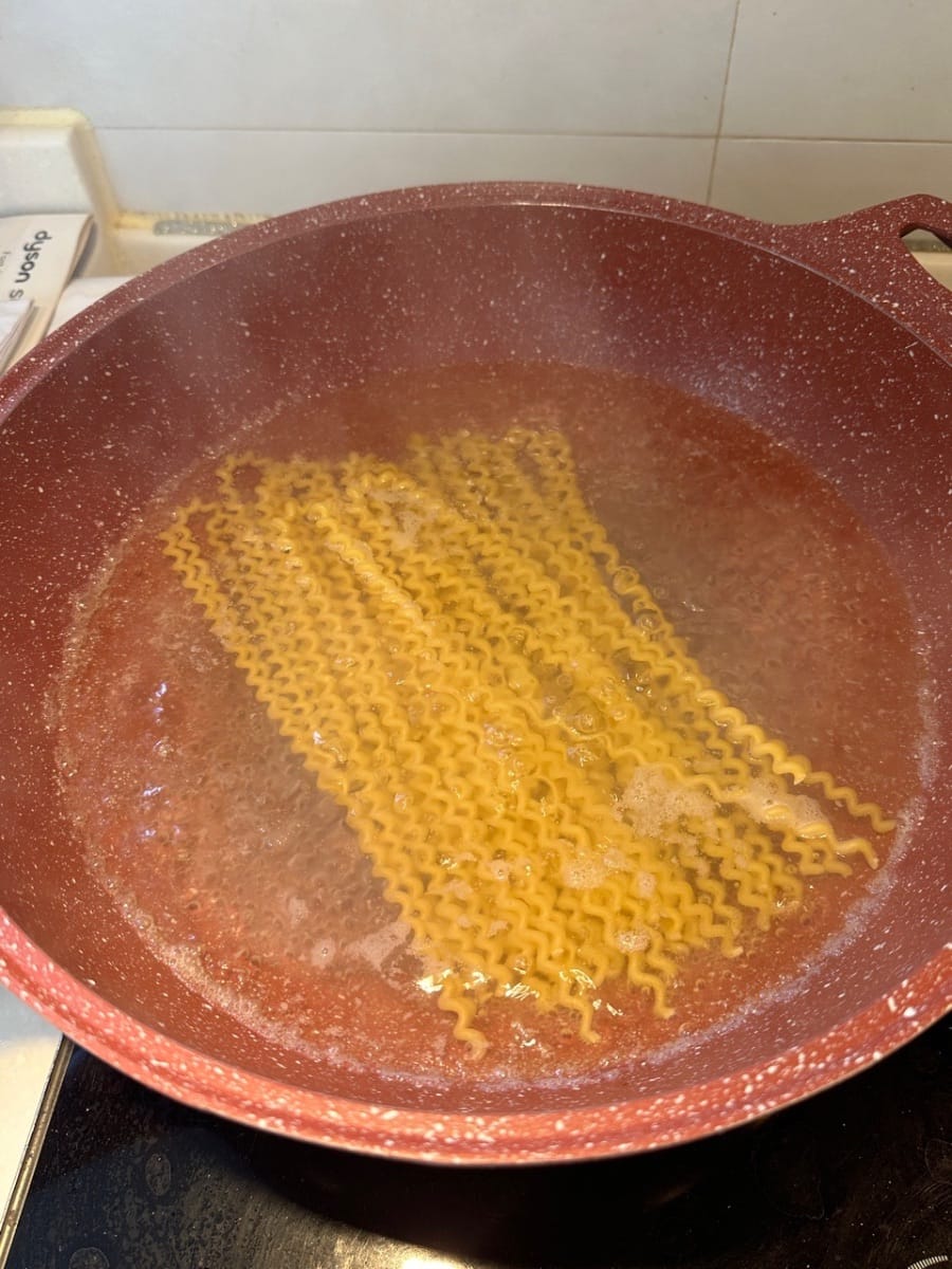- En una olla con agua hirviendo, agrega sal y cocina tu pasta según el empaque (la mía se cocinó por 15 minutos)