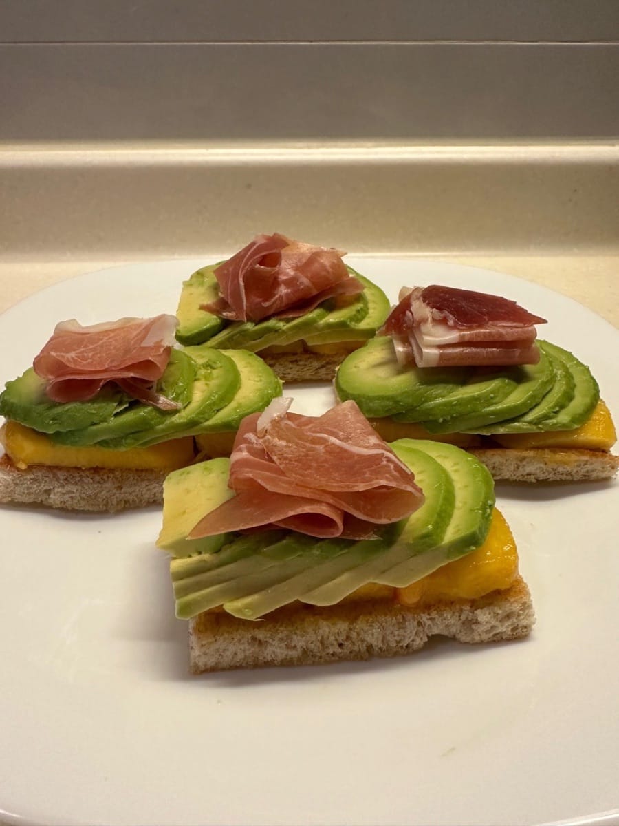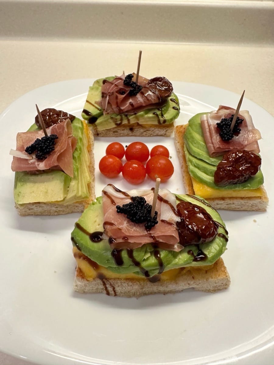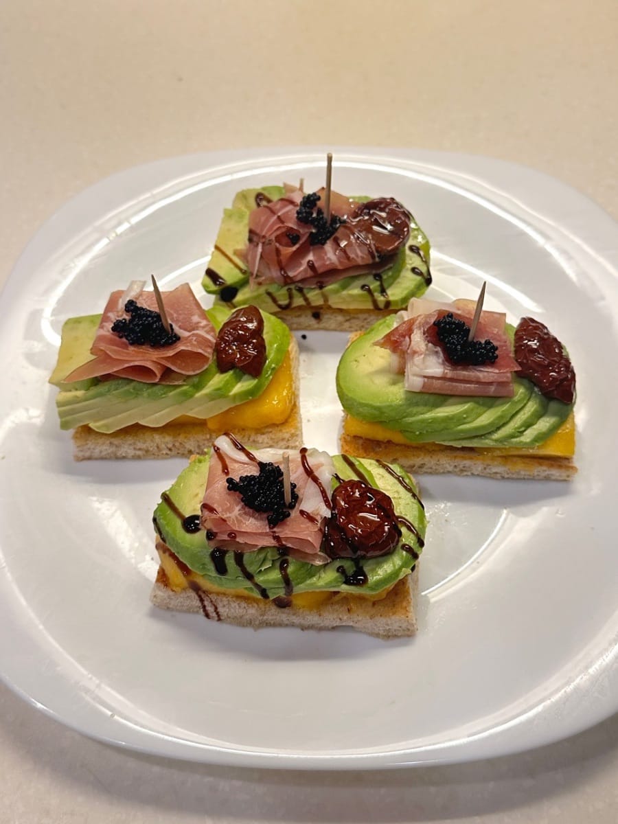 Les tapas avocat-pêche blanche sont des canapés toastés de la taille d'une bouchée, garnis de prosciutto, de pêche blanche et d'avocat, agrémentés de touches de caviar, de tomates séchées au soleil et d'un filet de vinaigre balsamique brillant pour un contraste sucré-salé, crémeux et croquant.