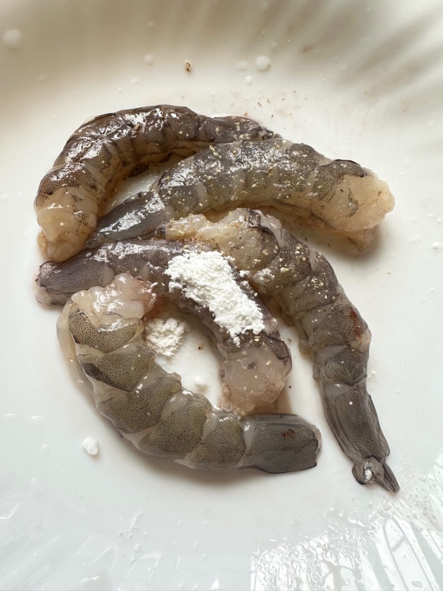 Après avoir décortiqué les crevettes, ajoutez un peu de fécule de maïs, de sel et de poivre, mélangez bien et réservez.