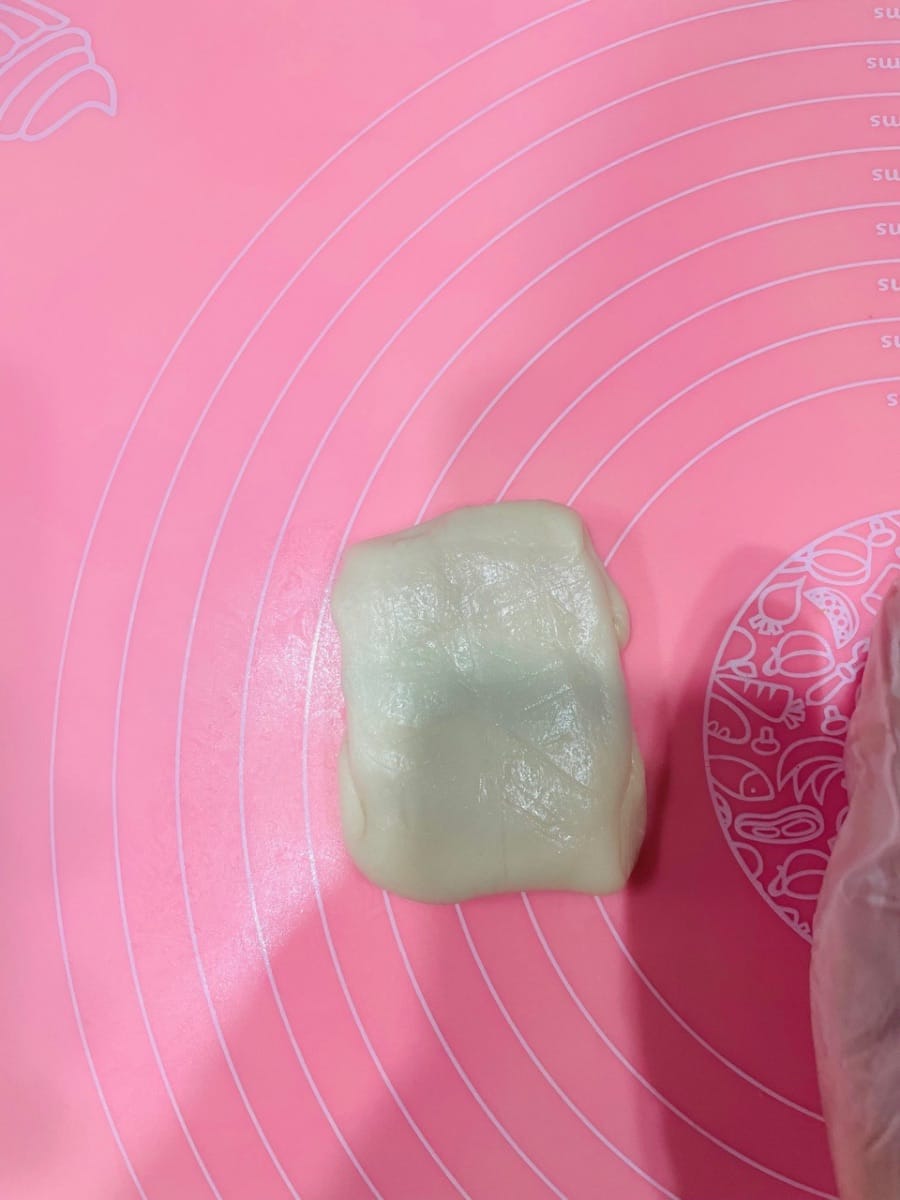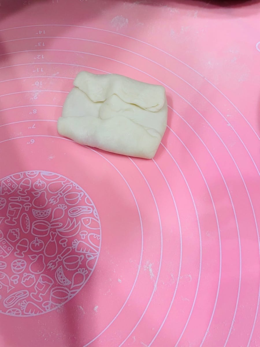 Déposez trois portions de 9 g de pâte à base d’huile (ou une portion de 27 g) au centre de la pâte à l’eau, appuyez légèrement avec la paume de la main, puis repliez-la sur elle-même de haut en bas et de gauche à droite. Retournez-la et aplatissez-la délicatement avec un rouleau à pâtisserie, puis tapotez-la avec la main pour uniformiser la pâte à base d’huile et obtenir une surface plus lisse et esthétique. Ensuite, comme pour l’étalage de la pâte à l’eau, roulez-la dans le sens de la longueur, en veillant à ne pas la rouler d’avant en arrière. Retournez-la à nouveau et roulez-la. Ce roulage permet de mieux distinguer les couches de pâte à l’eau et de pâte à base d’huile, ce qui donnera une texture feuilletée plus belle à la cuisson.