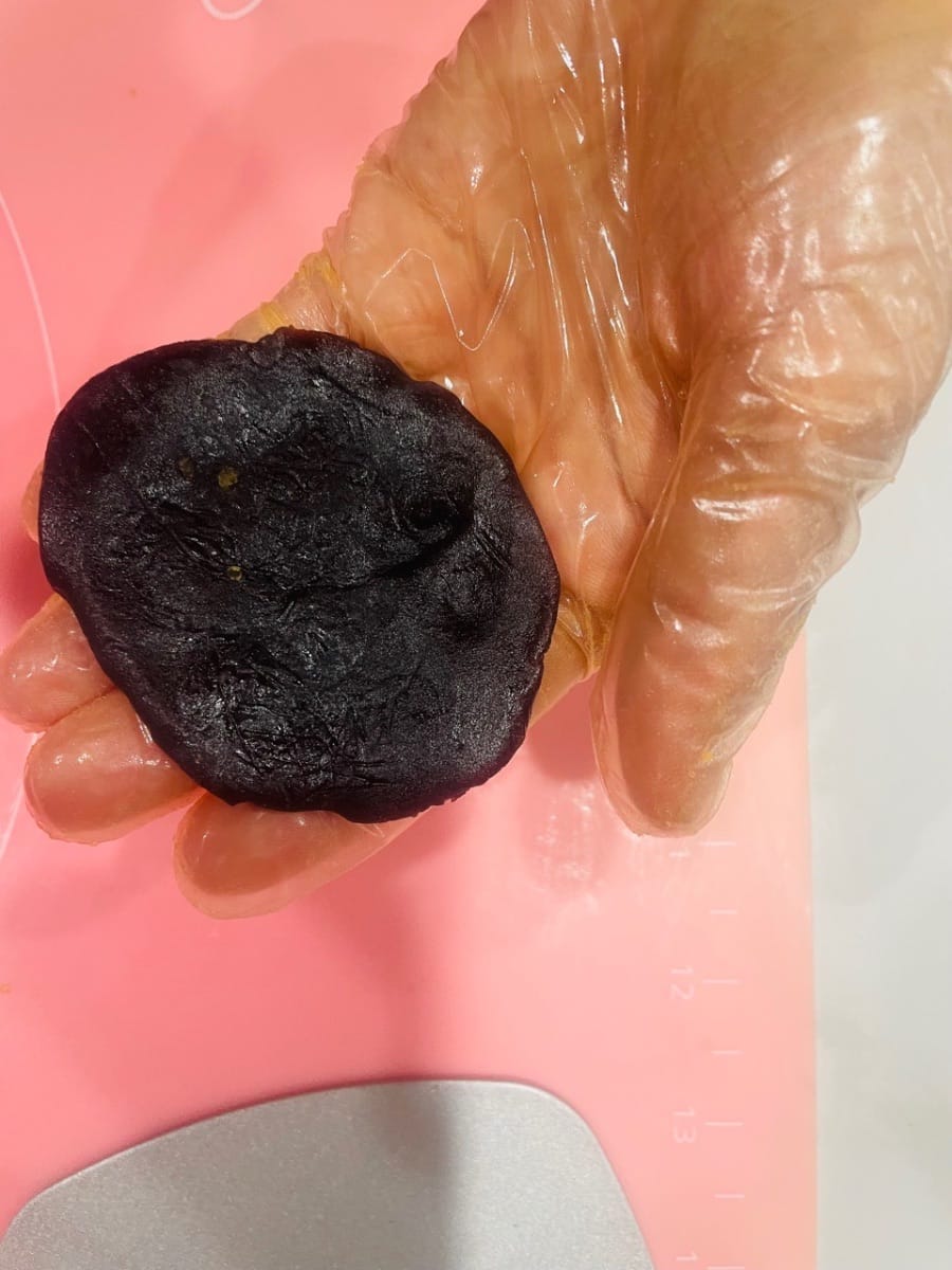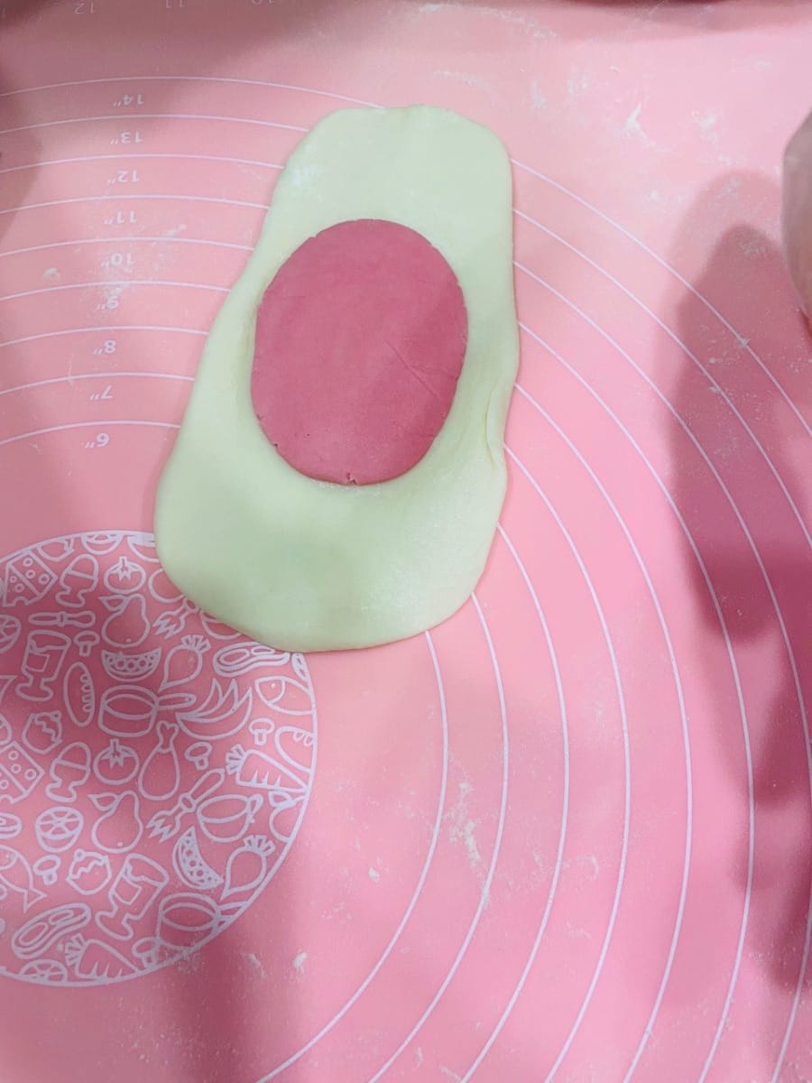 - Étaler et garnir. Placez la pâte, face coupée vers le haut, et appuyez avec la paume de la main. Retournez-la et enroulez-la sur elle-même en effectuant des mouvements de haut en bas, puis de gauche à droite à l’aide d’un rouleau à pâtisserie. Soulevez-la et faites-la tourner pour affiner les bords. Enveloppez la farce de pâte de haricots rouges et de jaune d’œuf salé à l’intérieur, en la scellant avec le pouce et l’index. Veillez à ne pas trop rapprocher le centre de la spirale de votre paume lors de la fermeture, afin d’éviter de déformer la pâte. Pincez fermement l’ouverture. La rotation pendant l’étalage assure une pâte uniforme, et le fait de bien pincer la farce empêche celle-ci de s’échapper à la cuisson.