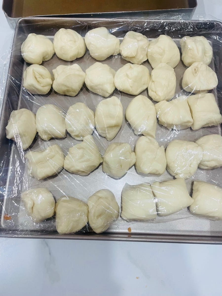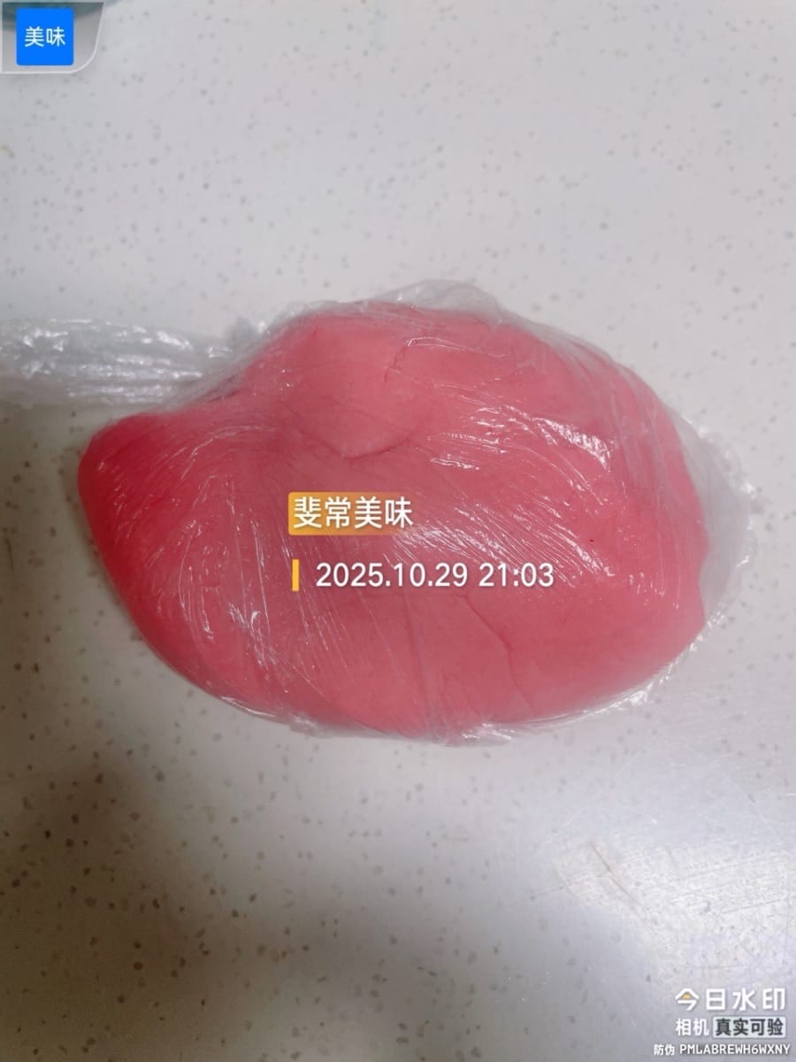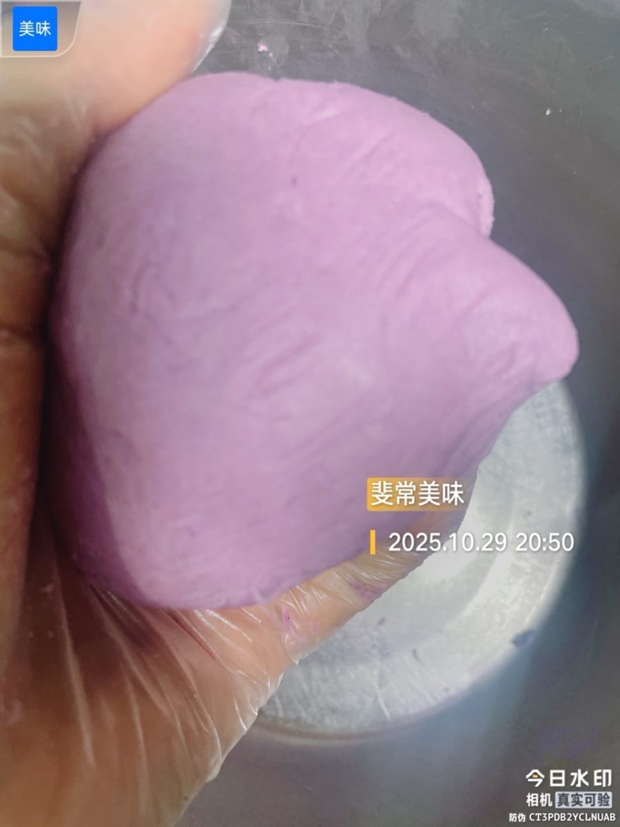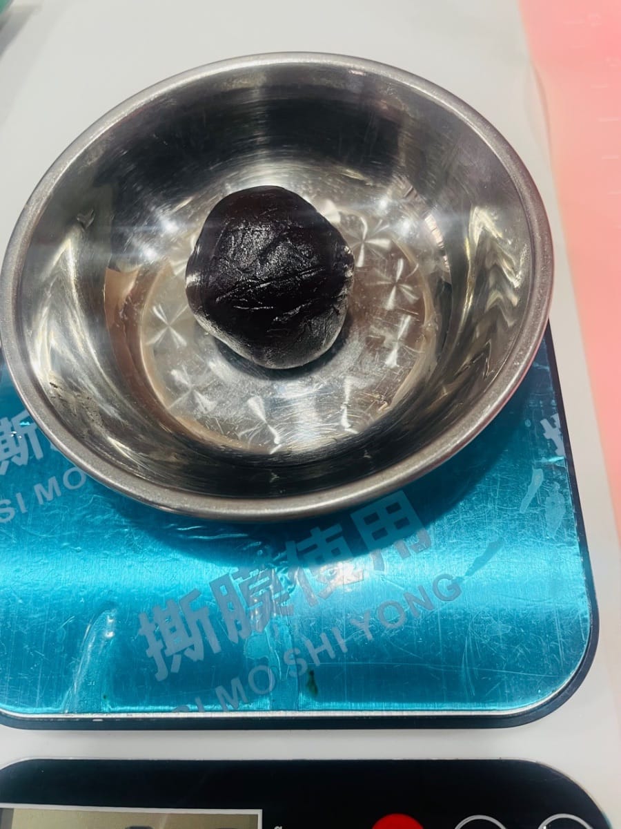 - Divisez la pâte de haricots rouges en portions de 30 g et formez des boulettes. La pâte de haricots rouges est essentielle pour atténuer le goût salé de la farce de porc effiloché et de jaune d’œuf ; répartissez-la en portions et garnissez-en les boulettes de farce.
