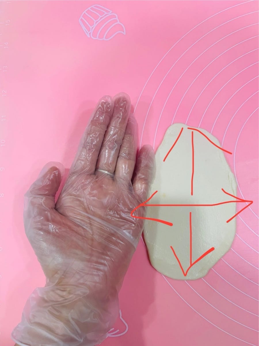 - Étaler la pâte. Prenez un morceau de pâte, aplatissez-le légèrement, puis étalez-le une fois de haut en bas, puis une fois à gauche et une fois à droite, jusqu’à obtenir une largeur d’environ 1 cm. Cette méthode permet d’obtenir une pâte uniforme et facilite l’enrobage de la farce à base d’huile.