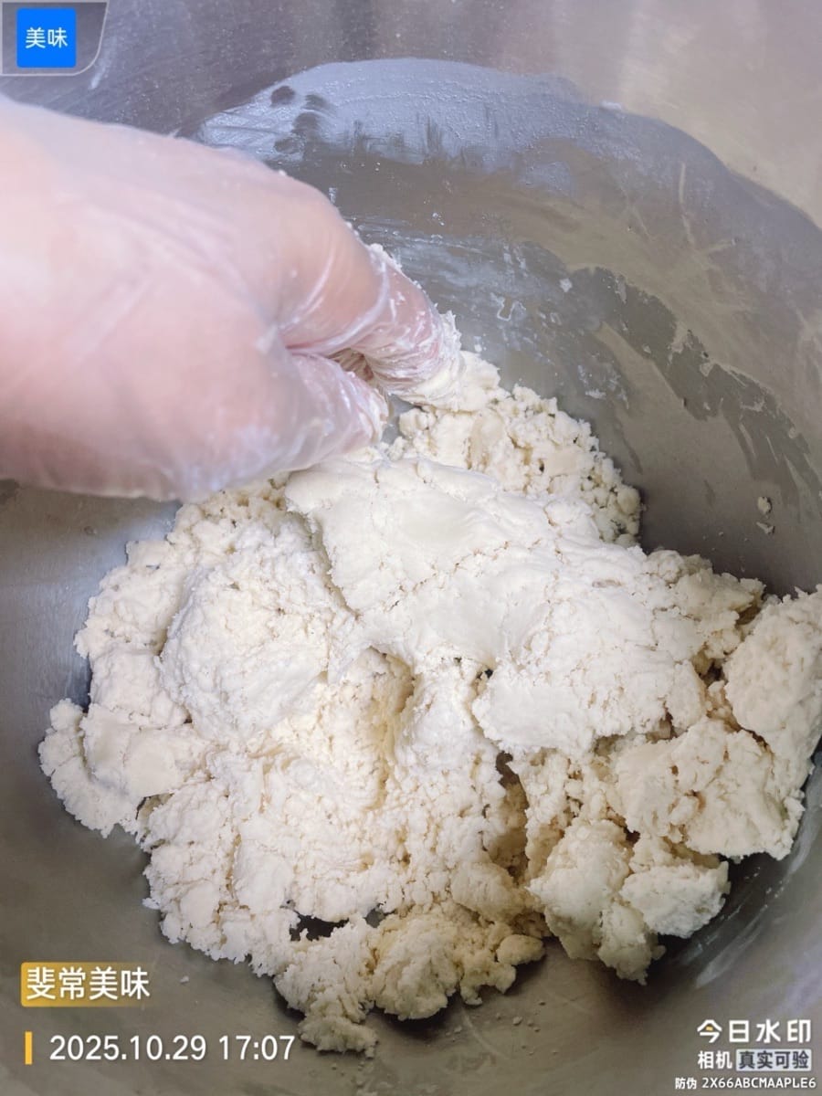 - Mélangez tous les ingrédients jusqu'à ce qu'il ne reste plus de farine sèche. Cette pâte à base d'huile est essentielle pour obtenir une texture feuilletée ; la séparer de la pâte à base d'eau permettra d'obtenir des couches croustillantes à la cuisson.