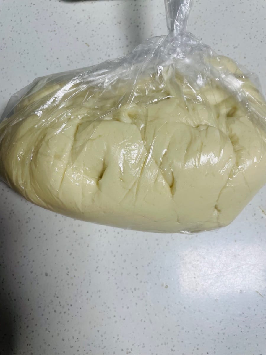 - Placez tous les ingrédients de la pâte à l'huile dans un saladier et pétrissez jusqu'à obtenir une fine membrane (9 couches). Si vous ne parvenez pas à former une membrane à 90 %, vous pouvez la réfrigérer (dans le bac à légumes) une nuit avant utilisation. Après réfrigération, elle deviendra élastique. La pâte à l'huile doit être élastique pour enrober la garniture à base d'huile. La pétrir jusqu'à former une membrane garantit une extensibilité suffisante et évite qu'elle ne se déchire facilement lors de l'étalage.