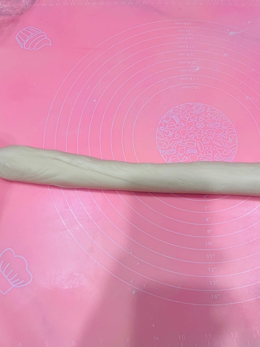 Une fois toutes les boules de pâte préparées, prenez-en une et coupez-la rapidement en deux dans le sens de la longueur. Ensuite, face coupée vers le haut (face à vous), aplatissez-la légèrement avec la paume de votre main. Le couteau doit être bien aiguisé, sinon la coupe sera irrégulière et cela affectera la forme finale.