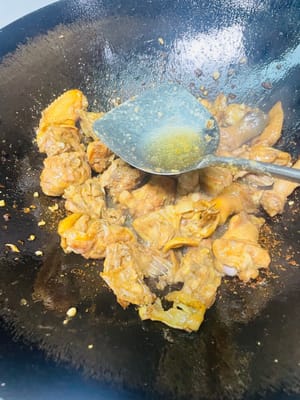 - Setelah menuang minyak ke dalam wajan panas, gunakan wajan minyak yang lebar agar ayam tidak lengket di wajan. Saat menuang ayam yang sudah dimarinasi, ingatlah untuk meratakan potongan daging dan menggorengnya perlahan di atas api sedang hingga permukaannya berwarna cokelat keemasan. Pada saat ini, aroma daging akan keluar. Sangat penting untuk menuang anggur masak dari sisi wajan. Penguapan alkohol dapat menghilangkan bau amis dan membuat daging lebih empuk. Saat menuang, taburkan secara melingkar di sepanjang dinding wajan, dan aromanya akan langsung tercium. Jangan sering membaliknya selama langkah ini. Tunggu hingga satu sisi berwarna cokelat keemasan sebelum membaliknya. Warnanya akan terlihat lebih baik.