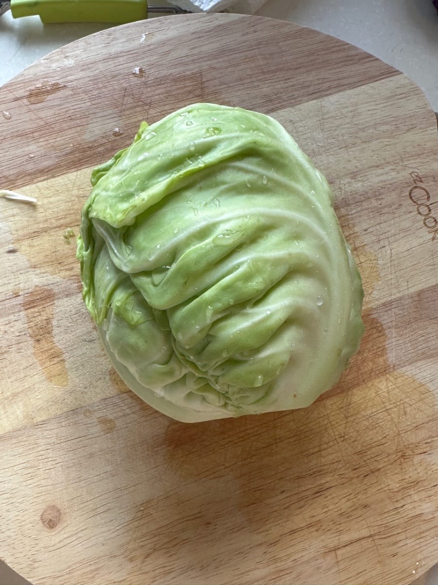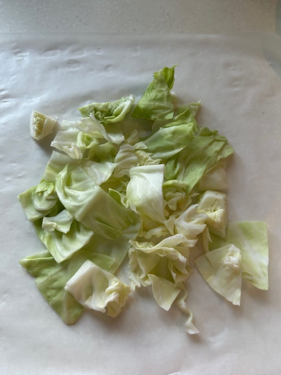 Potong kubis menjadi potongan besar seperti yang ditunjukkan, cuci bersih, dan sisihkan.