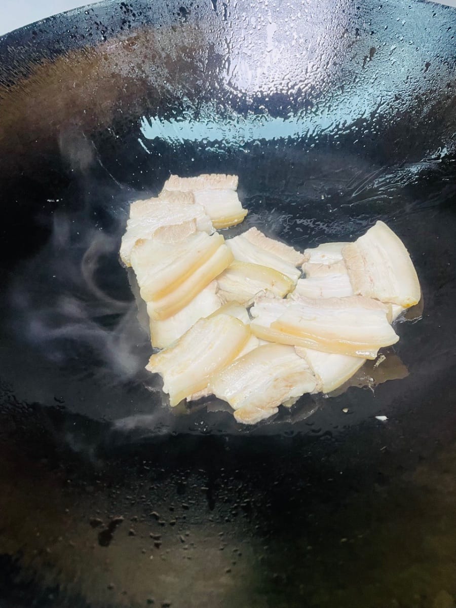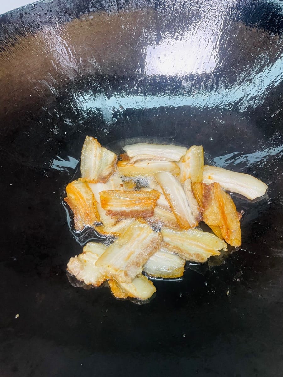 - Menggoreng perut babi: Masukkan dua sendok makan minyak goreng ke dalam wajan, panaskan, lalu masukkan irisan perut babi dan goreng hingga berwarna cokelat keemasan di kedua sisinya (hati-hati dengan cipratan minyak, gunakan penutup untuk mencegah luka bakar), lalu angkat dan sisihkan.
