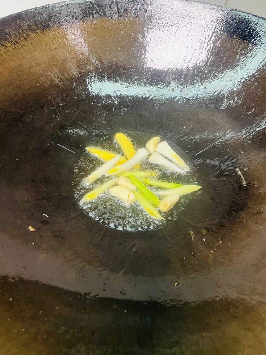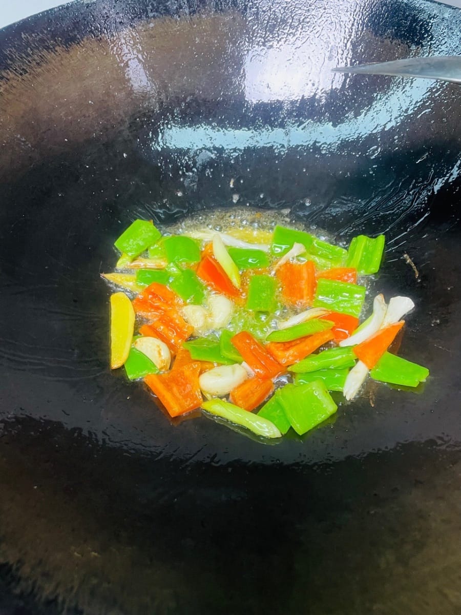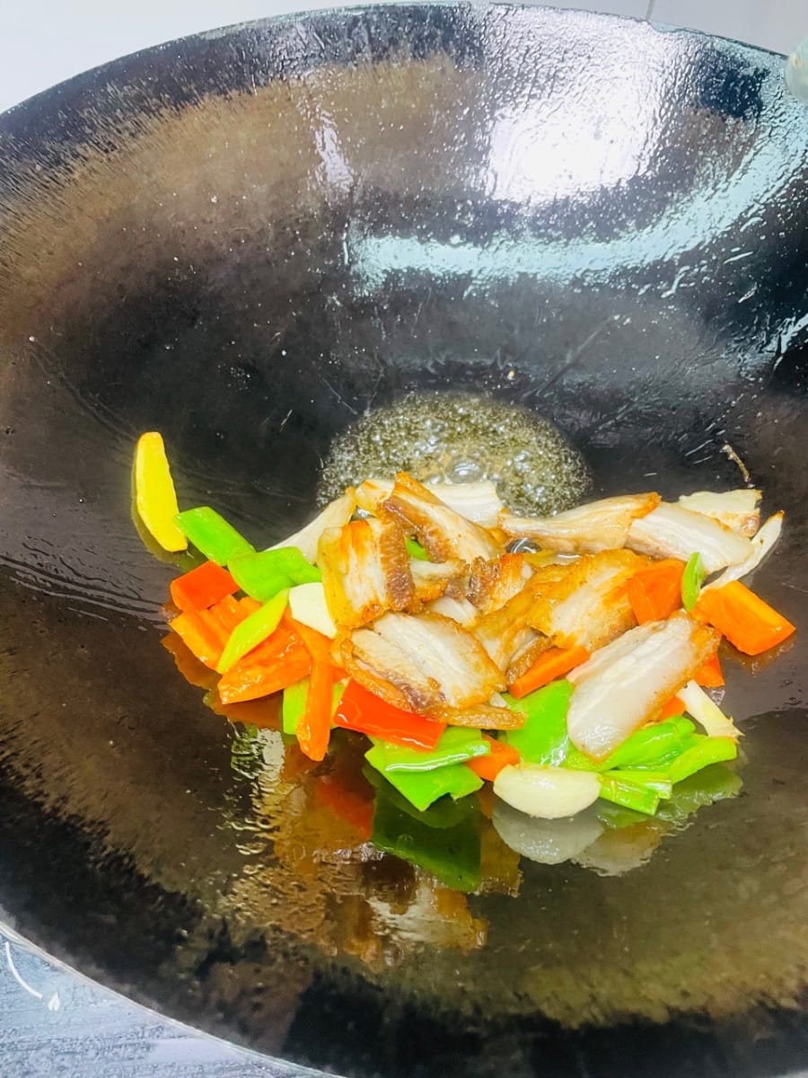 - Tumis bahan-bahan: Dengan menggunakan minyak sisa menggoreng perut babi di wajan, tumis siung bawang putih, irisan jahe, dan akar tunas bawang putih hingga harum, lalu tambahkan paprika hijau dan merah dan tumis selama 1 menit.