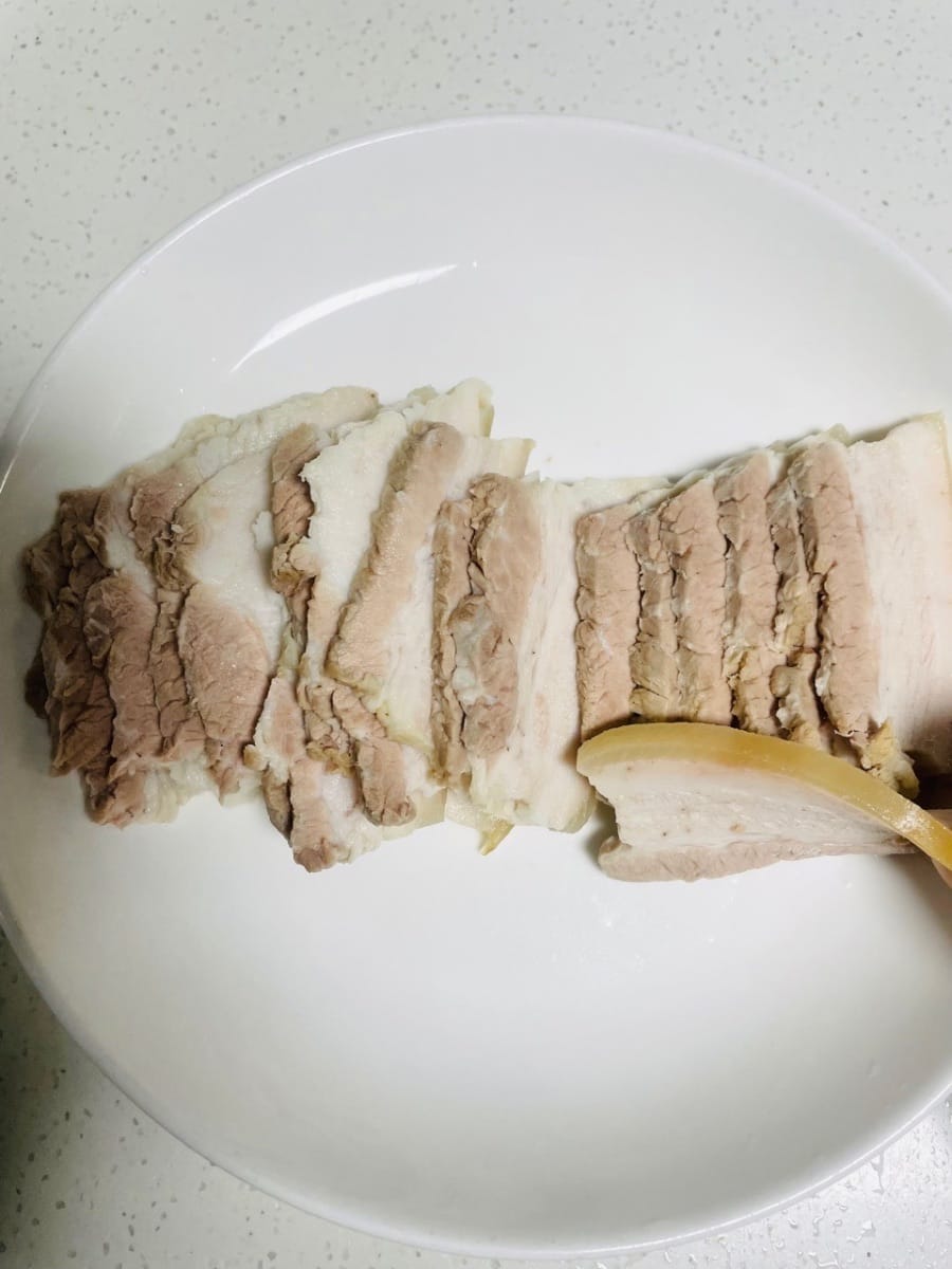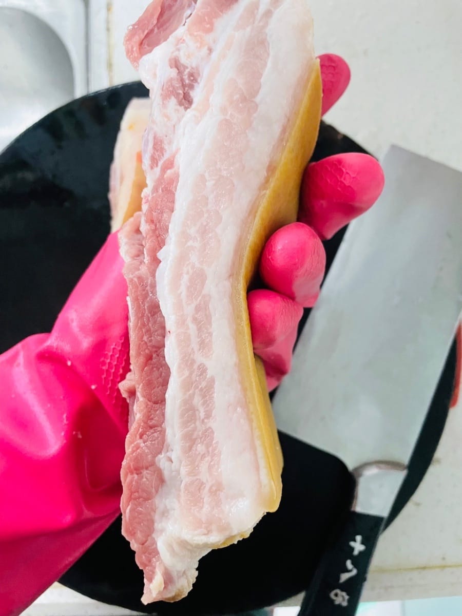 - Keluarkan daging perut babi yang sudah dibentuk dan potong tipis-tipis sekitar 2 mm.