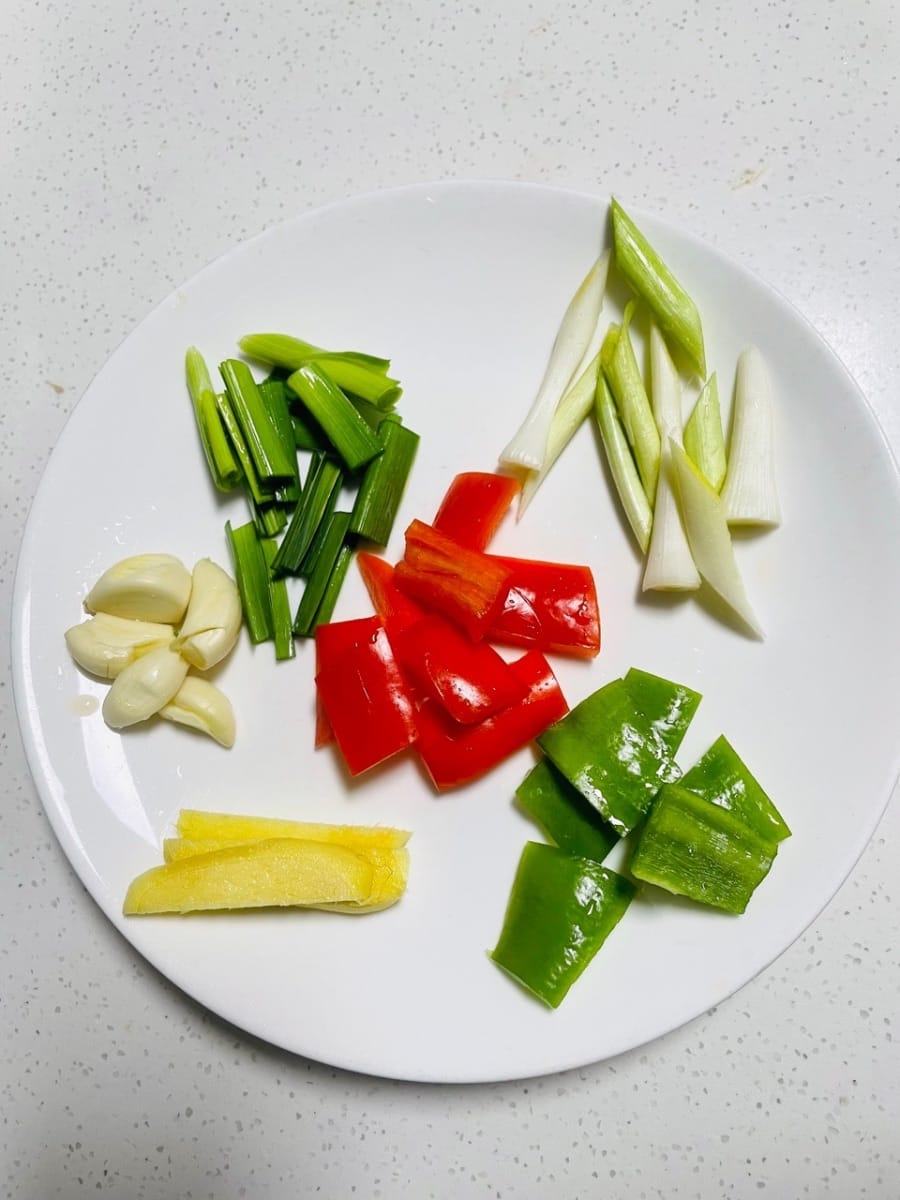 - Bahan-bahan: Hancurkan siung bawang putih, iris jahe, cuci tunas bawang putih dan pisahkan bagian putih, akar, dan hijau bawang putih menjadi potongan kecil, serta potong paprika hijau dan merah menjadi potongan kecil.
