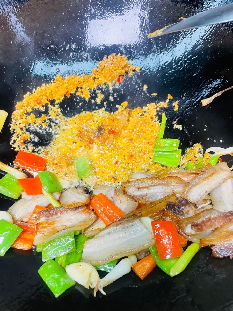 - Tumis: Masukkan kembali daging perut babi yang sudah kecoklatan ke dalam wajan, tambahkan cabai yang sudah dihaluskan, dan tumis dengan api kecil selama satu menit. Wajan akan mendesis dan mengeluarkan aroma yang kaya. Bagi yang menyukai rasa yang lebih kuat, tambahkan satu sendok pasta kacang cabai Pixian; rasa gurih, pedas, dan lezat akan langsung terasa lebih intens.