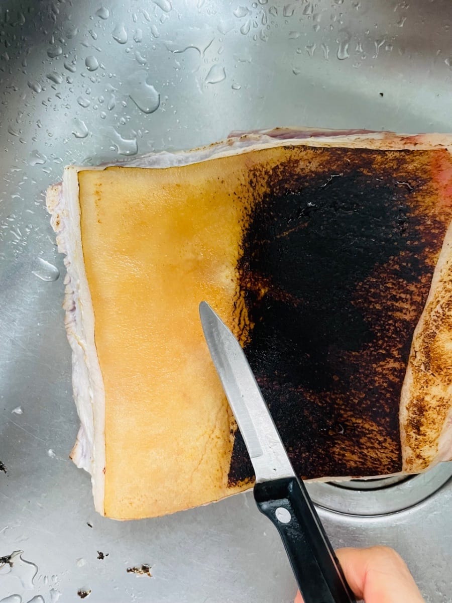 - Menyiapkan perut babi: Pilih perut babi dengan keseimbangan lemak dan daging tanpa lemak yang baik. Minta tukang daging untuk membakar kulitnya untuk Anda. Setelah sampai di rumah, rendam dalam air hangat selama 10 menit, lalu gunakan pisau kecil untuk mengikis bagian yang terbakar. Milik saya hanya dikikis setengahnya. Kulit babi yang terbakar rasanya sangat lezat.