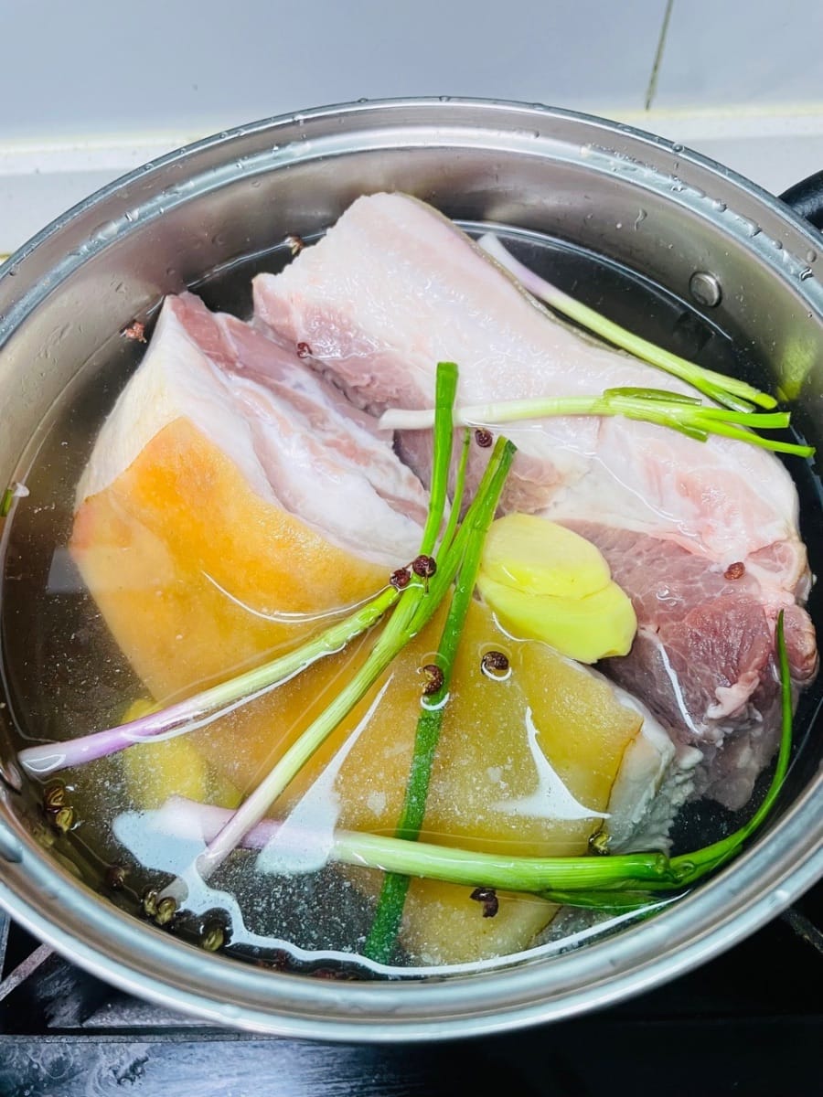 - Merebus/Membentuk: Masukkan perut babi ke dalam panci berisi air dingin, tambahkan daun bawang, anggur masak, merica kering, dan irisan jahe untuk direbus. Setelah air mendidih, masak selama kurang lebih 25 menit, angkat, bilas hingga bersih, dan dinginkan di lemari es selama setengah jam agar mengeras.