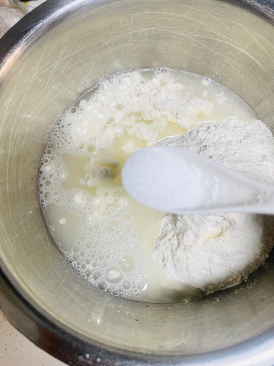 - Kunci membuat adonan pancake adalah dengan menambahkan tepung terigu serbaguna, tepung beras ketan, 10 gram minyak wijen, dan garam ke dalam mangkuk. Tambahkan air es sedikit demi sedikit sambil diaduk hingga terbentuk adonan yang halus dan tanpa gumpalan. Adonan harus mengalir dengan lancar dalam aliran tipis saat diangkat dengan sendok. Kemudian tambahkan setengah dari makanan laut yang telah disiapkan dan aduk rata.