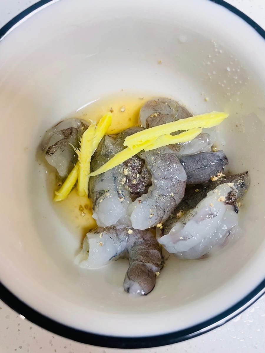 - Bersihkan udang segar dengan membuang urat dan kotorannya. Potong tentakel cumi-cumi menjadi potongan kecil (camilan ini dipilih secara mendadak, saya tidak punya, tetapi Anda sebaiknya memilikinya) lalu bilas dan tiriskan. Masukkan ke dalam mangkuk, tambahkan jahe parut, lada hitam yang baru digiling, 1 sendok makan sake Korea, dan sedikit garam laut. Aduk rata dan rendam selama 15 menit. Merendam secara menyeluruh akan menghilangkan bau amis dan meningkatkan kesegaran. Setelah direndam, tiriskan cairan sepenuhnya dan buang jahe parutnya.