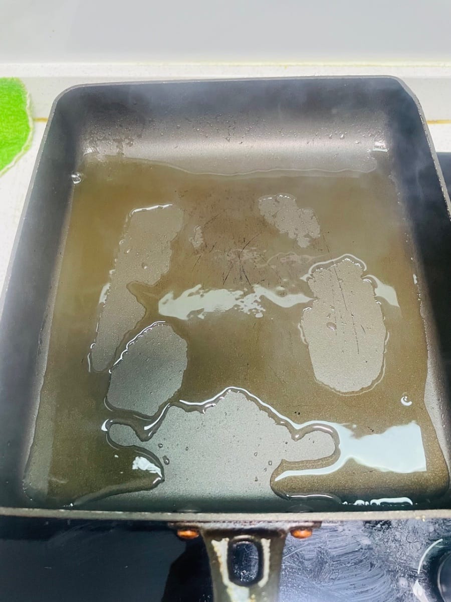 - Oleskan sisa 10g minyak wijen dan minyak kacang pada wajan, panaskan minyak hingga 60% (sedikit berasap), lalu kecilkan api menjadi sedang-rendah.