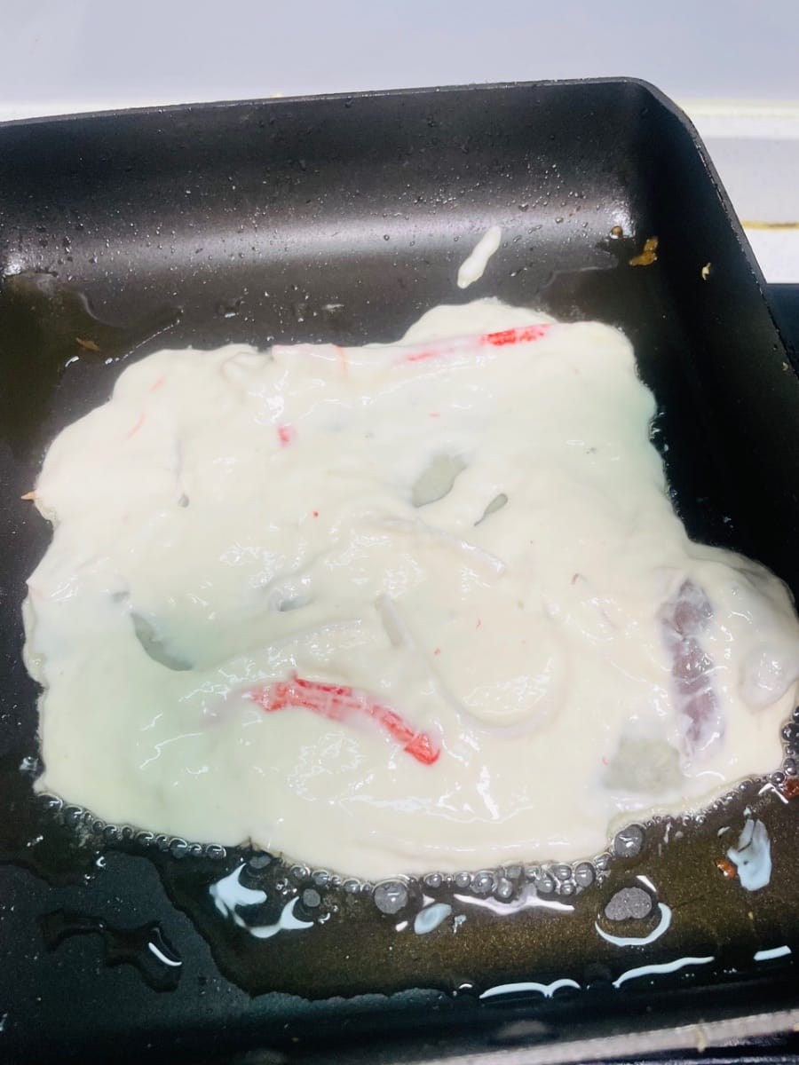 - Goreng adonan dasar pancake hingga berwarna cokelat keemasan dan matang. Pertama, letakkan makanan laut dan potongan daun bawang secukupnya di atasnya, lalu tambahkan irisan cabai (saya menggantinya dengan irisan wortel). Selanjutnya, tuang 1/4 adonan.