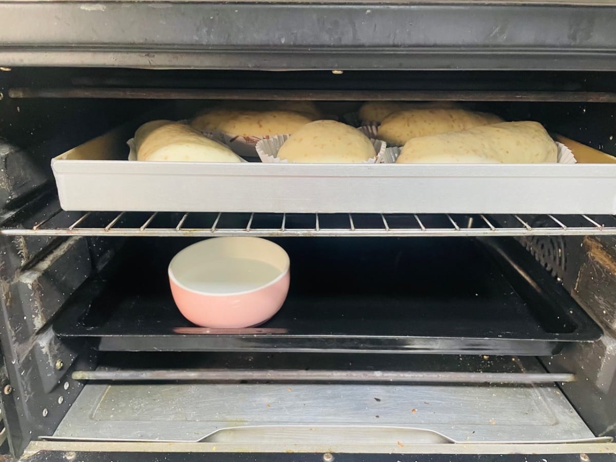 - Letakkan adonan roti yang sudah digulung di dalam oven, tambahkan semangkuk air panas, dan biarkan mengembang lagi hingga ukurannya menjadi 1,5 kali ukuran semula. Semprotkan sedikit air di permukaannya dan taburi dengan bubuk keju kering.