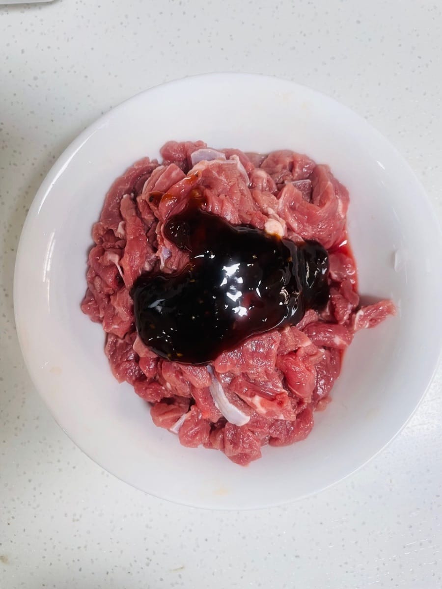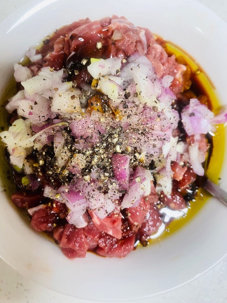 - Sambil menunggu adonan mengembang, siapkan isiannya: potong daging sapi menjadi dadu kecil/cincang, tambahkan kecap asin encer, bubuk lada hitam, 1 sendok makan anggur masak, 20 gram saus barbekyu (atau saus lada hitam steak jika tidak ada saus barbekyu), lalu tambahkan bawang bombay yang sudah dipotong dadu dan aduk rata. Diamkan setidaknya selama setengah jam agar daging sapi menyerap bumbu.