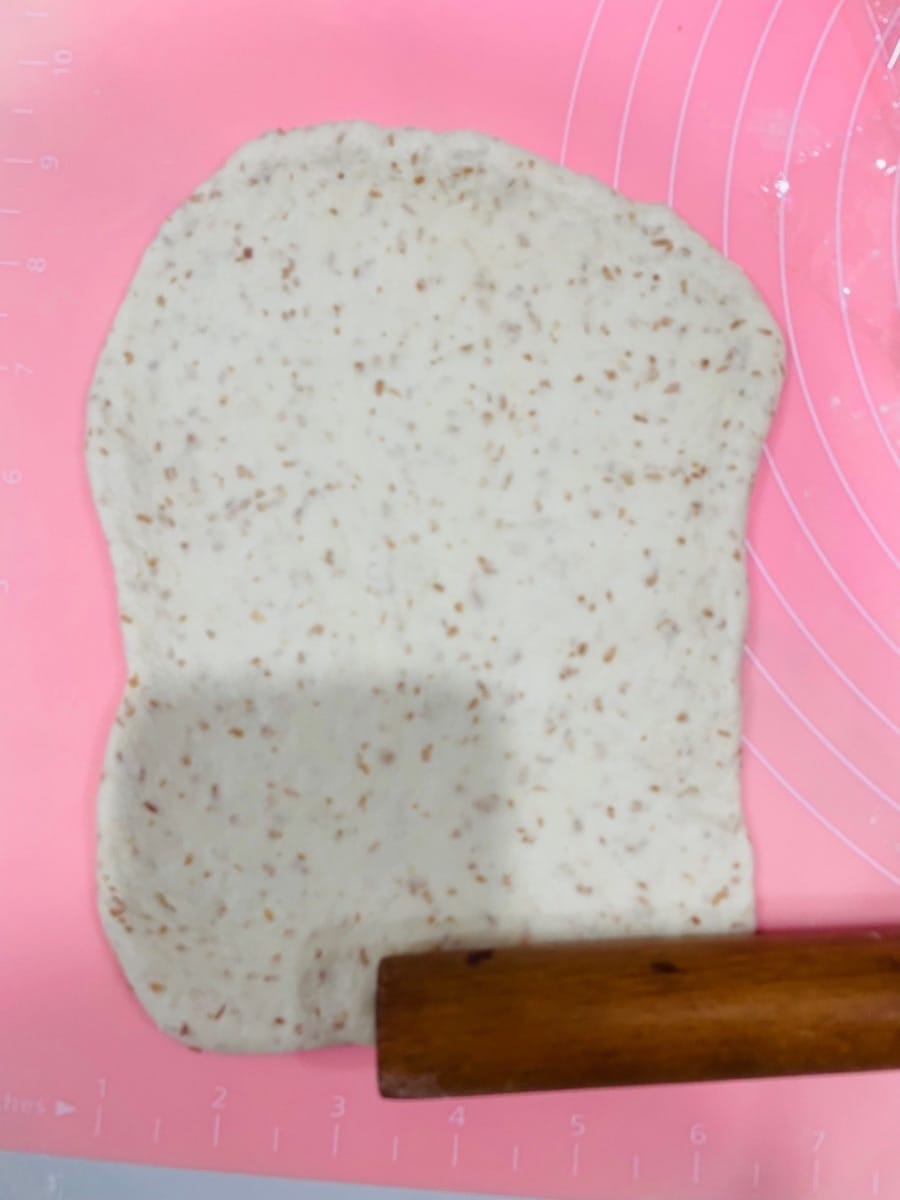 - Ambil sedikit adonan dan giling hingga membentuk persegi panjang yang besar dan tipis.