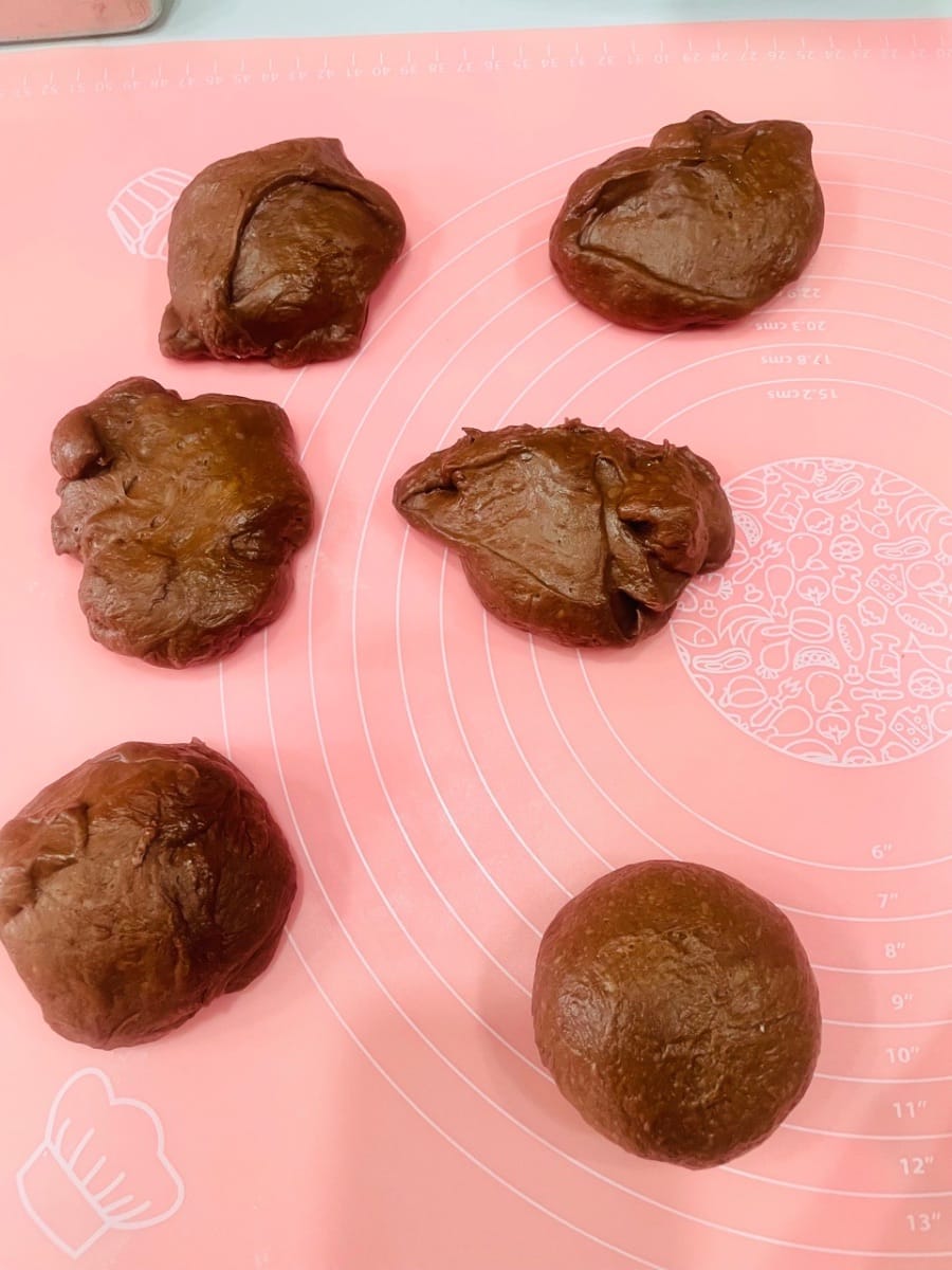 - Dividete l'impasto lievitato in 6 porzioni uguali, formate delle palline, copritele con pellicola trasparente e lasciatele riposare per 15 minuti (se non sapete come fare, guardate il video).