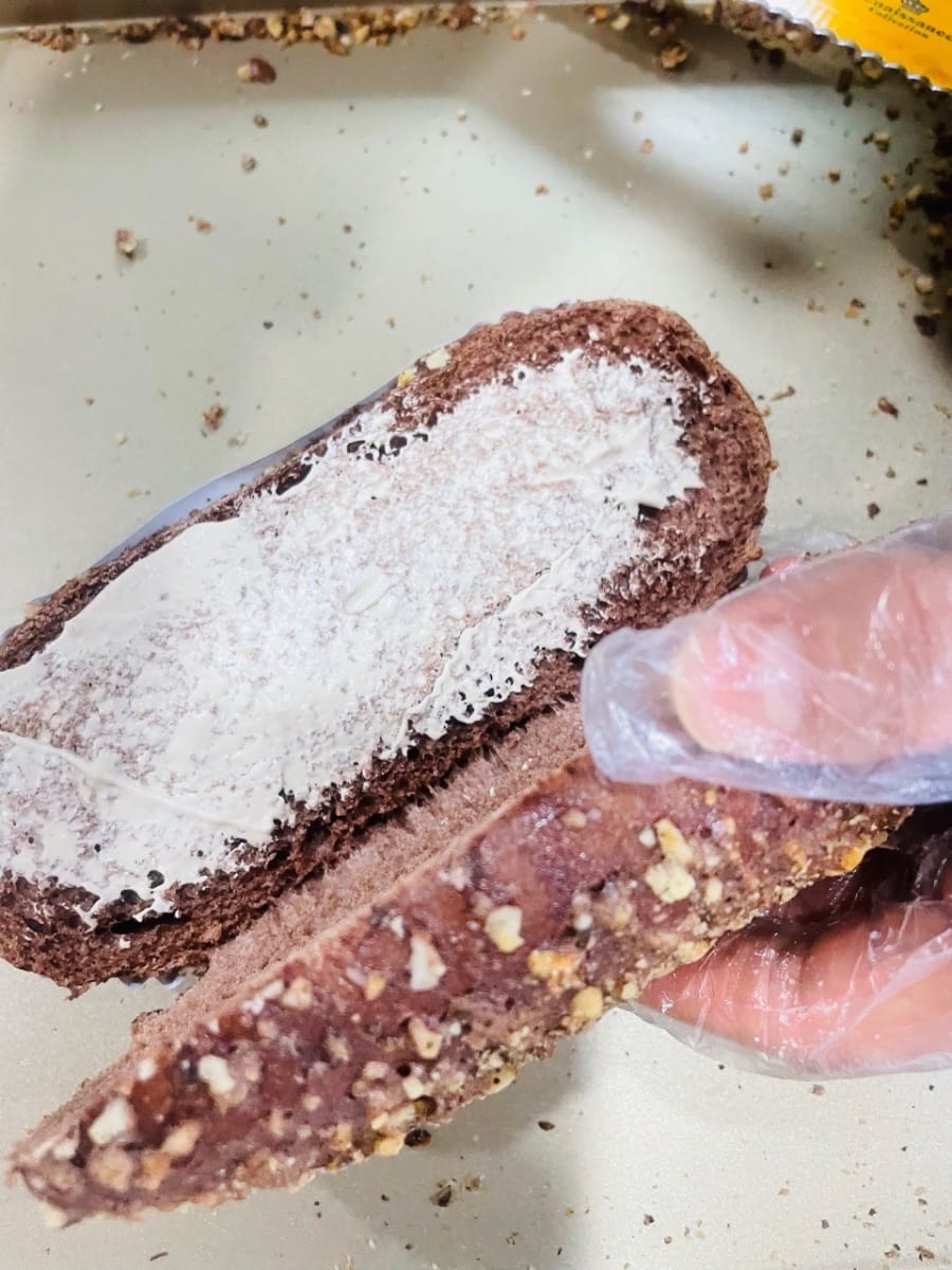 Basta montare la panna, il cacao in polvere e lo zucchero fino a raggiungere il 90% di consistenza. Ha una consistenza più leggera ed è meno pesante. Quando lo mangi, taglia semplicemente il pane, aggiungi il ripieno e il gioco è fatto! È delizioso 😋