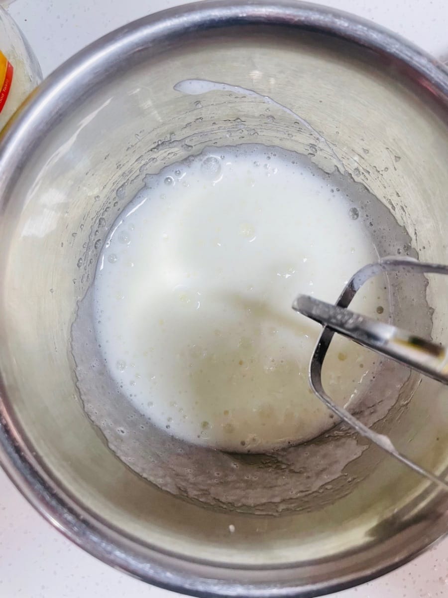 - Versare il composto di latte e uova, impastare a bassa velocità per 3 minuti, quindi mescolare ad alta velocità per 6 minuti, fino a quando l'impasto può essere allungato fino a formare una membrana all'80%.