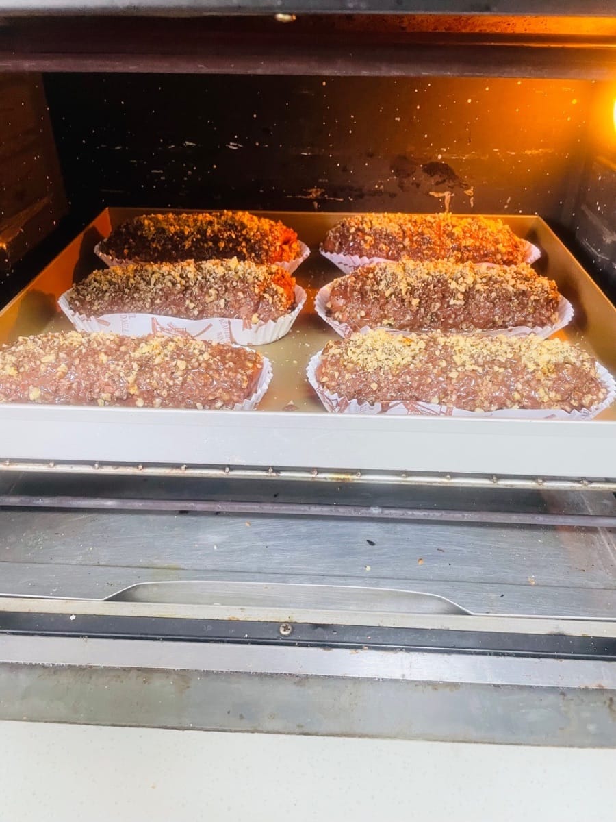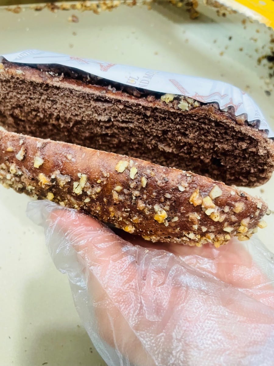 Questo pane Mario alle noci (noto anche come pane al cioccolato e noci o pane croccante alle noci e cacao) è ricoperto di noci tritate. Il primo morso sprigiona un'esplosione di aroma di nocciola, seguito da un ricco sapore di cioccolato che riempie il naso: non stucchevole, ma una delicata fragranza di cacao. Il pane in sé è morbido ma sostanzioso, gommoso ma non duro. L'aroma del cioccolato e il ricco sapore delle noci si intrecciano, diventando più saporiti a ogni morso. L'interno è soffice e delicato. Quando viene farcito con una leggera crema al cacao, il tocco rinfrescante della crema bilancia la ricchezza del cioccolato, mentre la croccantezza delle noci aggiunge ulteriore consistenza. Un morso offre un perfetto equilibrio tra croccantezza, morbidezza e aroma: così delizioso che non riuscirai a smettere di mangiarlo!