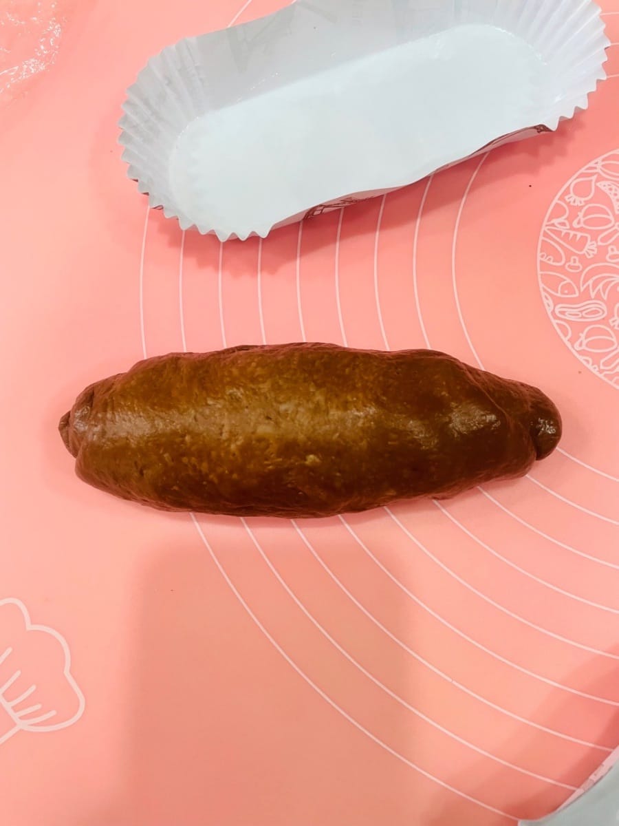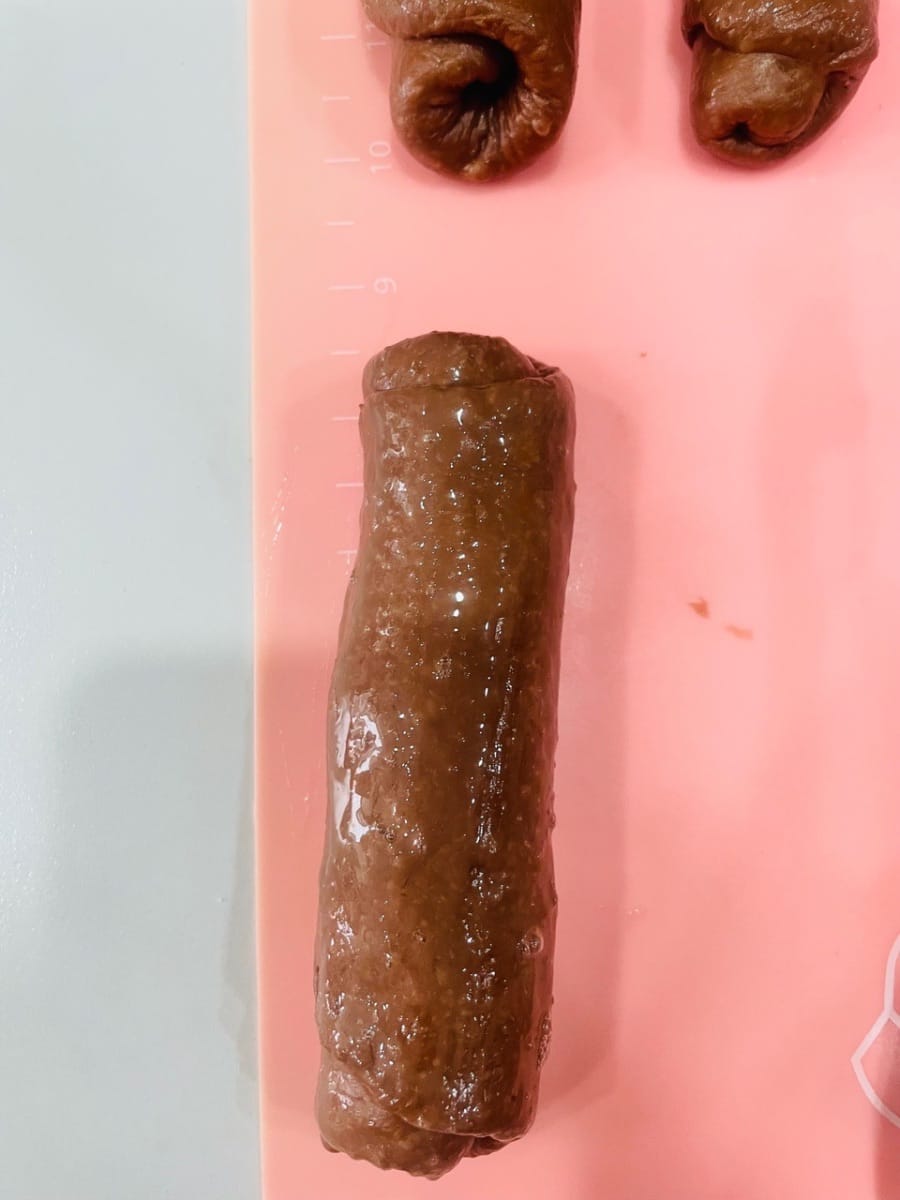 - Prendi una palla di pasta lievitata, stendila in una forma più larga in alto e più stretta in basso, quindi arrotolala dal lato stretto a quello largo, assicurandoti di sigillare bene la chiusura.