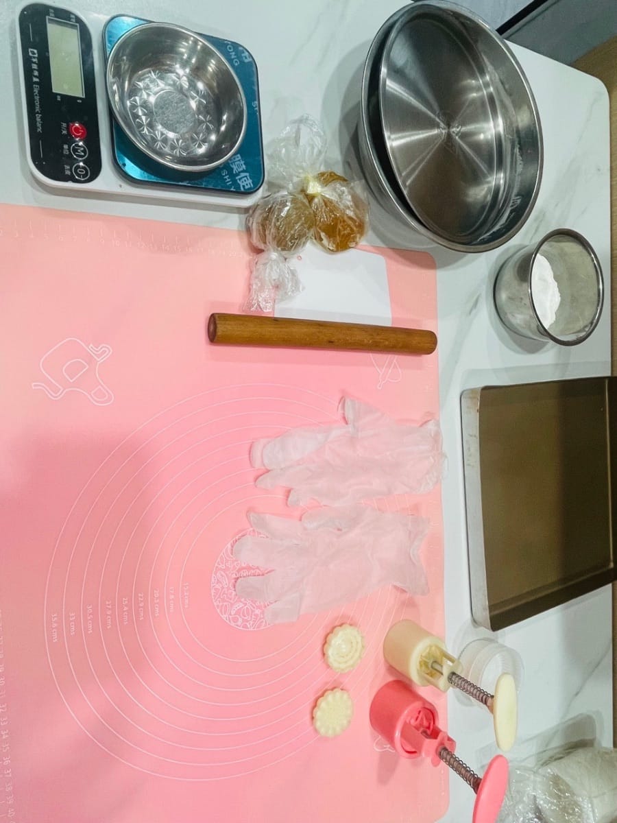 - Preparate gli ingredienti per avvolgere i mooncake. Prima di avvolgere i mooncake, procuratevi una bilancia, degli stampi per mooncake, la farina preparata, dei guanti (se non avete i guanti, infarinatevi le mani), un vassoio per mooncake e una scatola per evitare problemi in seguito.
