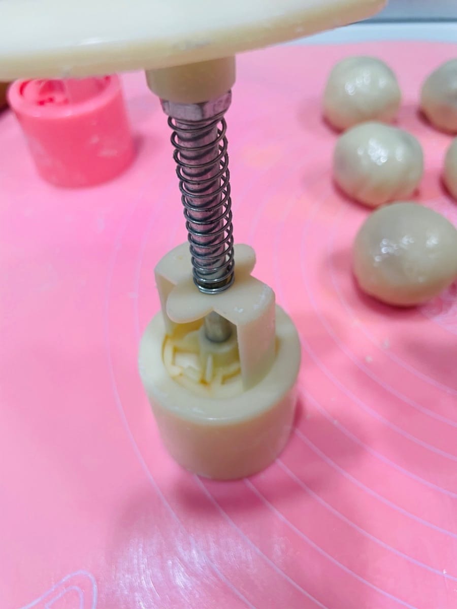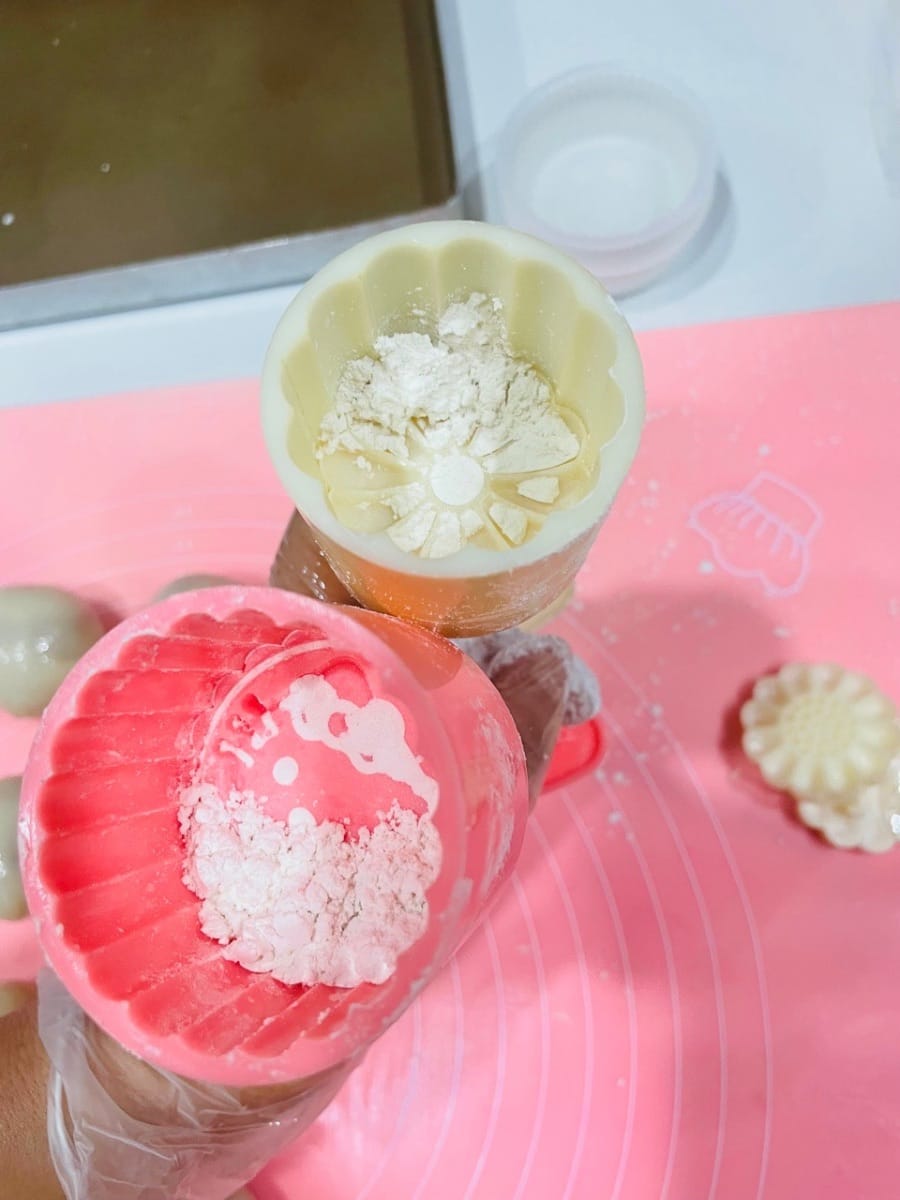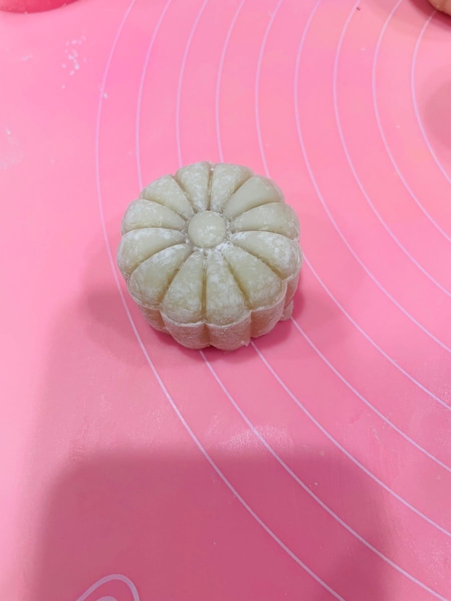Tenere la base dello stampo con la mano sinistra e premere con decisione con la mano destra. Una volta formato il motivo, spingere delicatamente lo stampo verso l'alto e sollevarlo. Si è formata una bellissima mooncake innevata.