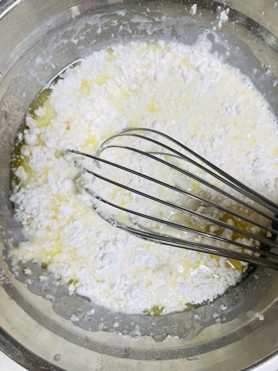 Versare tutti gli ingredienti, tranne la farina di riso glutinoso cotta e il ripieno, in una ciotola capiente e mescolare energicamente con le bacchette fino a ottenere un composto omogeneo.