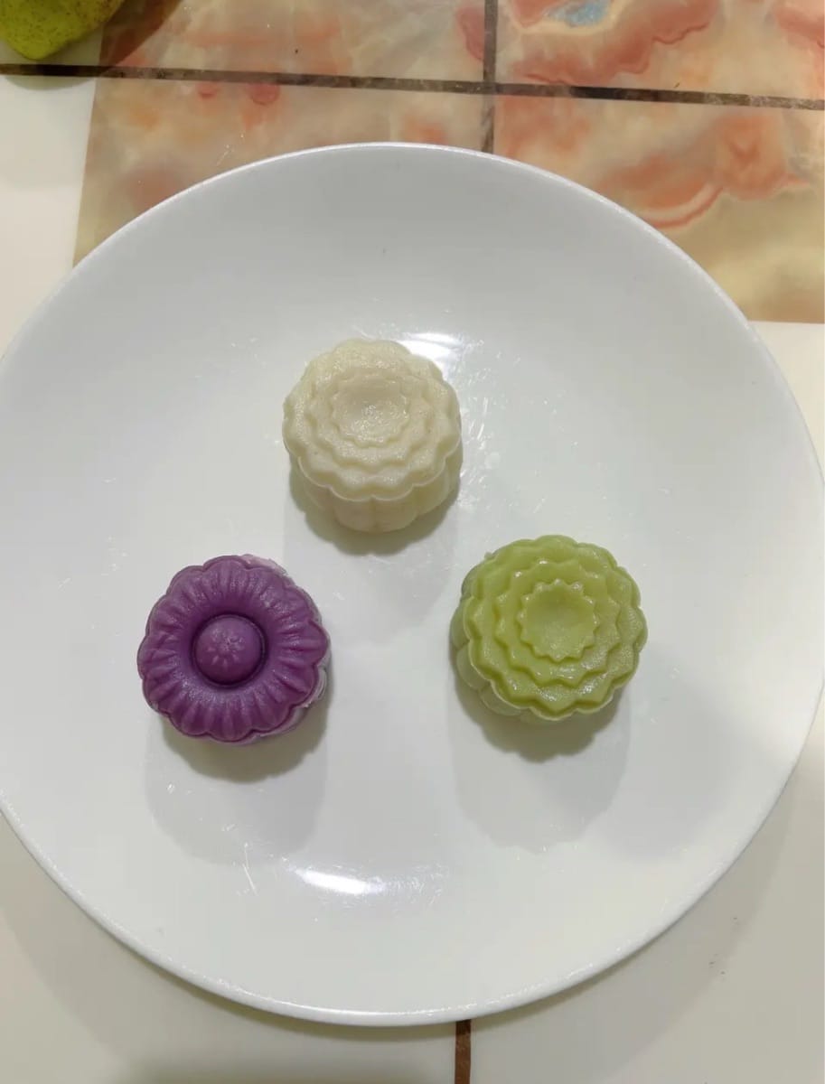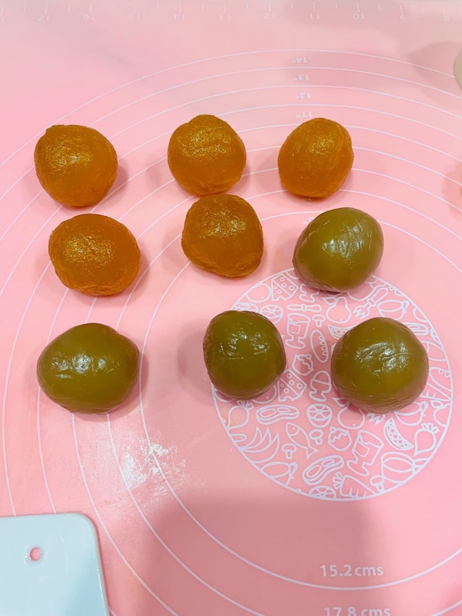 - Allego le foto dei miei mooncake con pasta di fagioli rossi al matcha e durian, come riferimento! Se volete ricreare lo stesso stile, seguite questa ricetta (aggiungete 5-8 grammi di polvere di matcha o farina di patate dolci viola quando preparate la buccia) e andrà tutto bene~