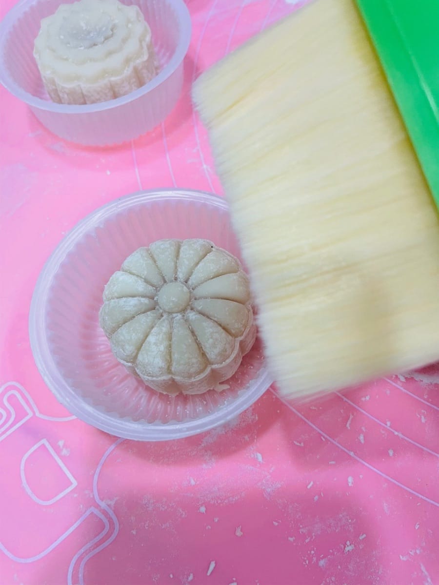 Utilizzare un pennellino (non in silicone, perché non si pulisce) per rimuovere delicatamente la farina in eccesso dalla superficie dei mooncake.