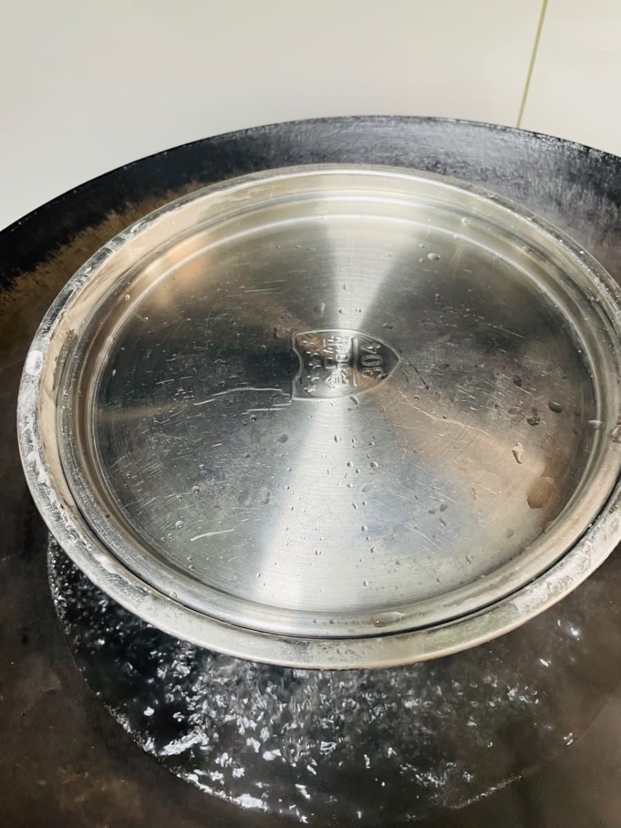 - Dopo circa 15 minuti di cottura a vapore, togliete la pellicola trasparente e date un'occhiata. Se ci sono punti poco cotti al centro, mescolate con le bacchette e continuate la cottura a vapore. Ricordatevi di tenere il coperchio per tutto il tempo, poiché il vapore gocciolerà nella buccia e la rovinerà. Inoltre, fate attenzione a non far asciugare l'acqua nella pentola.