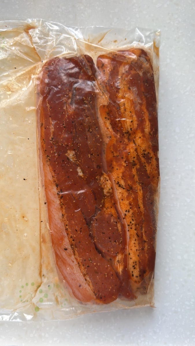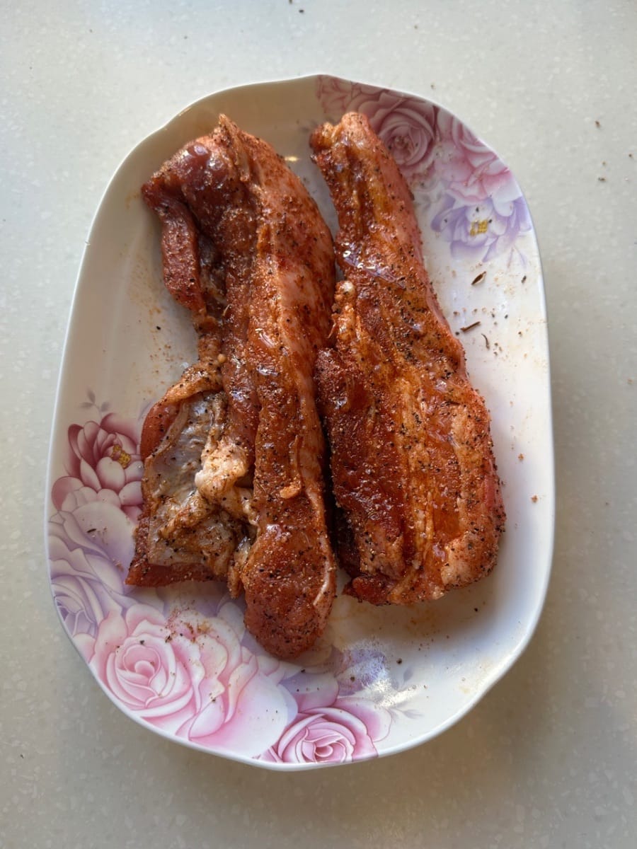 Per prima cosa lavare la pancetta di maiale e asciugarla con carta da cucina