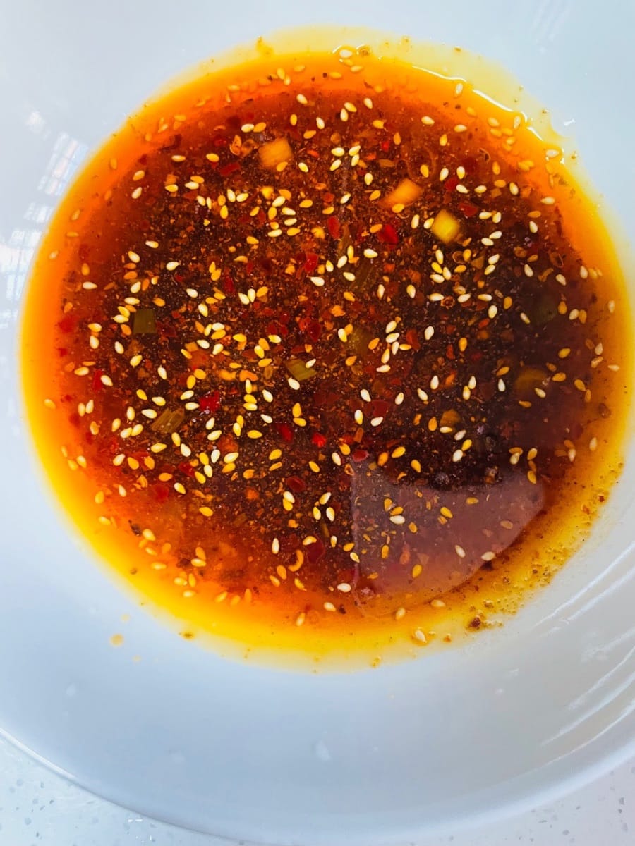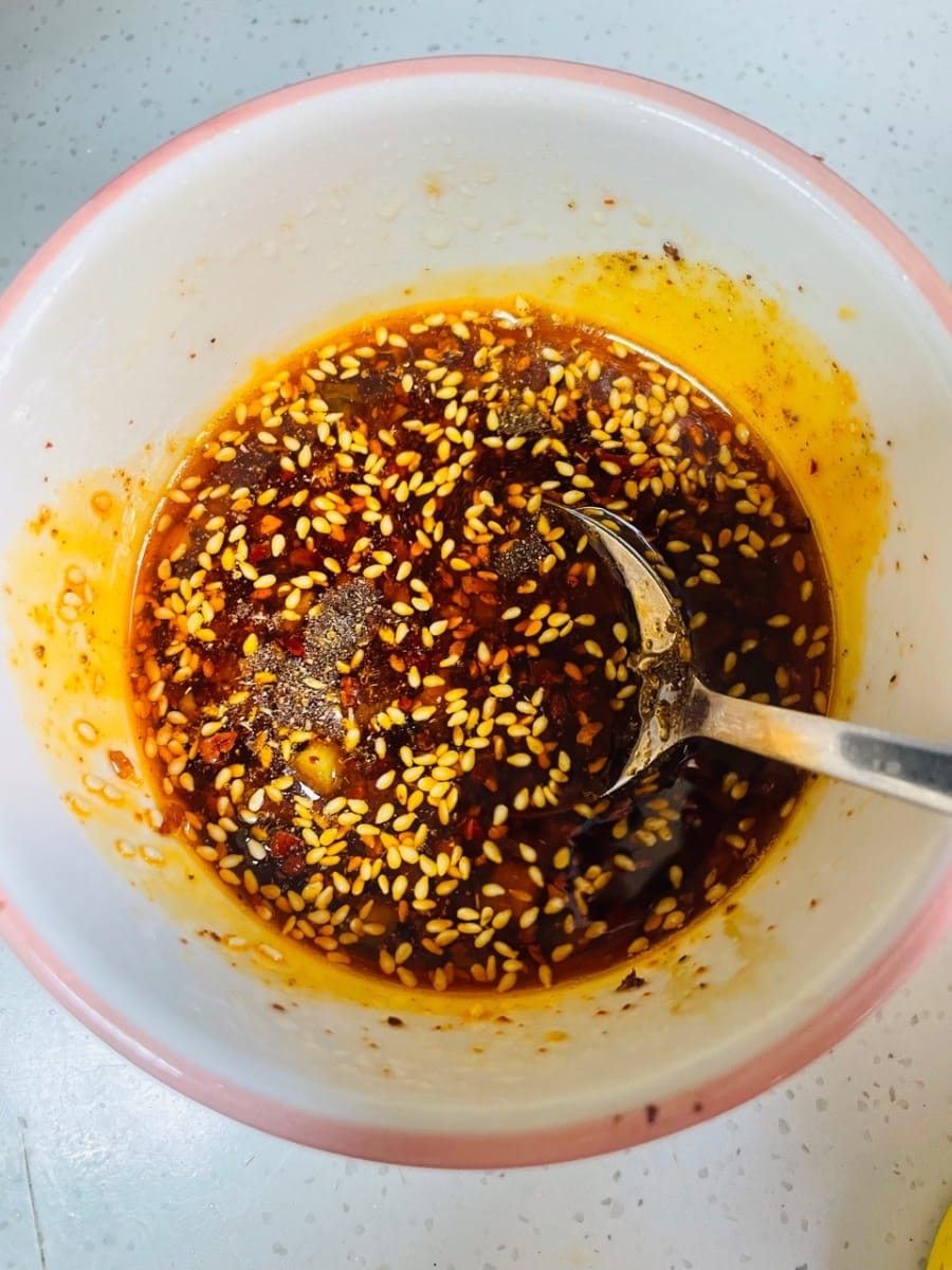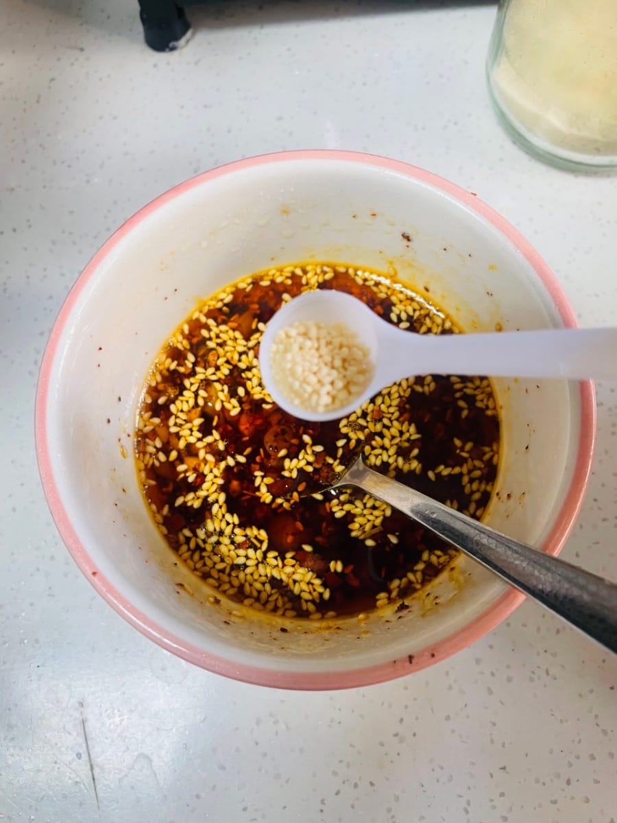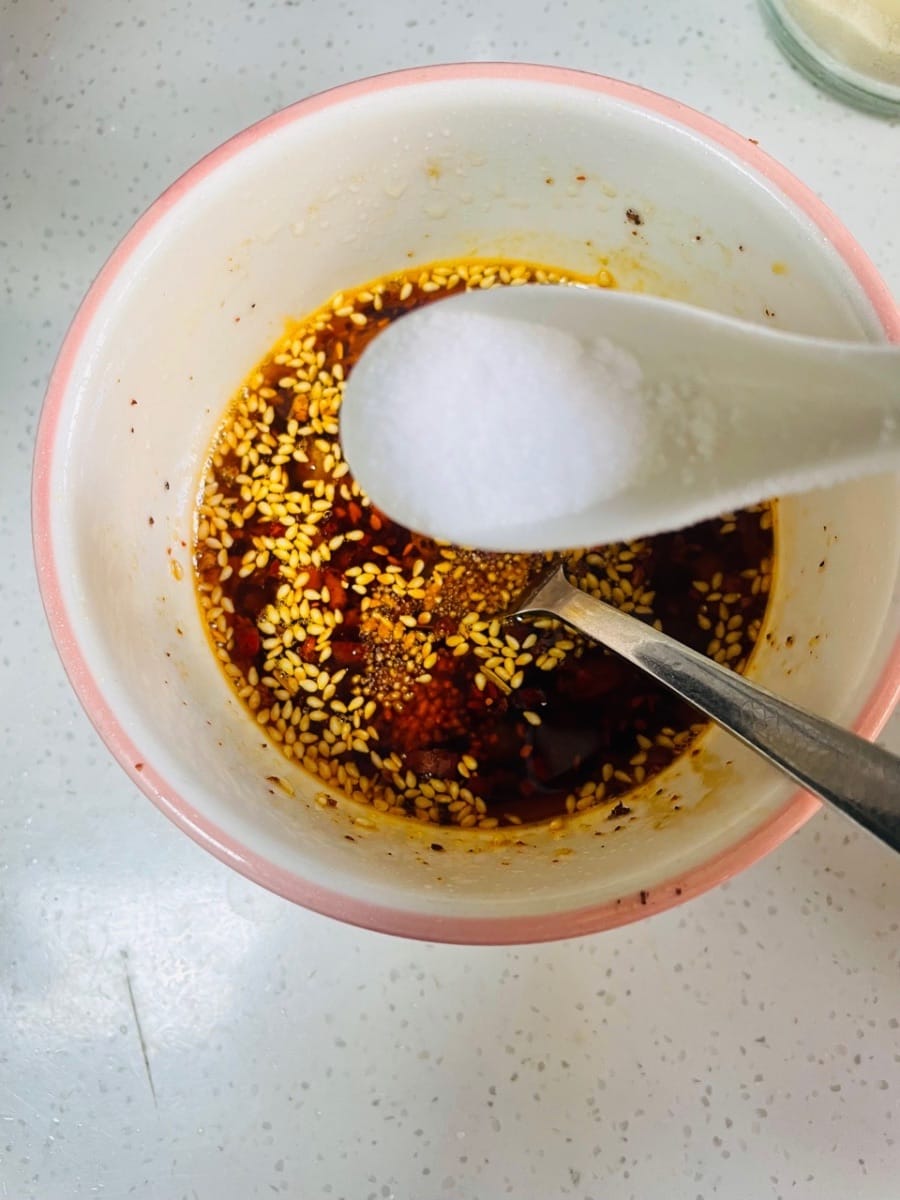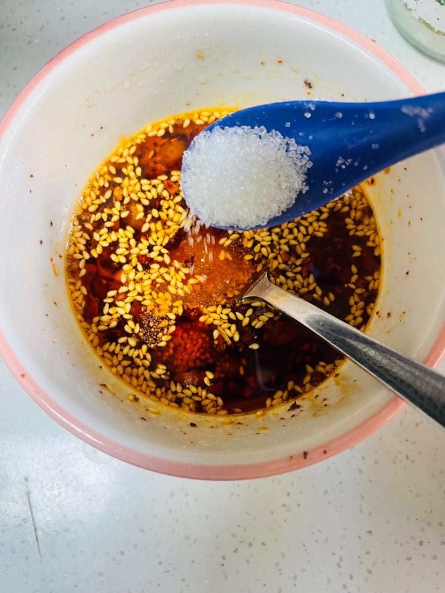 - Preparare la salsa soul: preparare una ciotola per condire, aggiungere l'aglio tritato, le foglie bianche di cipollotto tritate, 2 cucchiai di peperoncino in polvere e 1 cucchiaio di semi di sesamo bianchi.