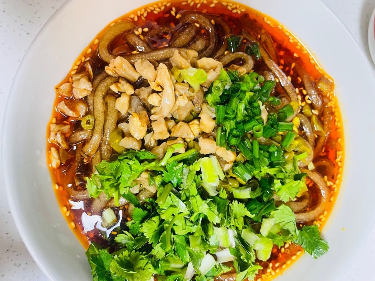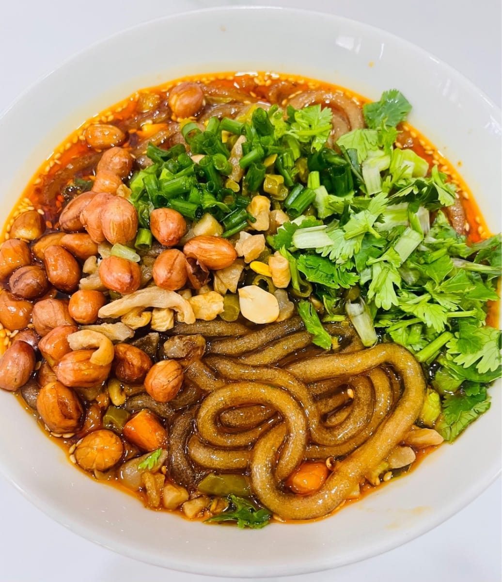 i noodles di patate dolci del Sichuan sono morbidi, gommosi e soffici, e assorbono il brodo aspro, piccante e intorpidente. Basta un sorso e il profumo è paradisiaco. Le arachidi sono croccanti, i ravanelli sottaceto e i fagiolini aggiungono una croccantezza rinfrescante, mentre il coriandolo e i cipollotti sprigionano la loro freschezza. Il sapore aspro e piccante è così avvincente che vorrete bere fino all'ultima goccia del brodo.
