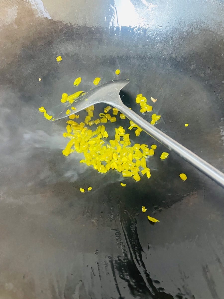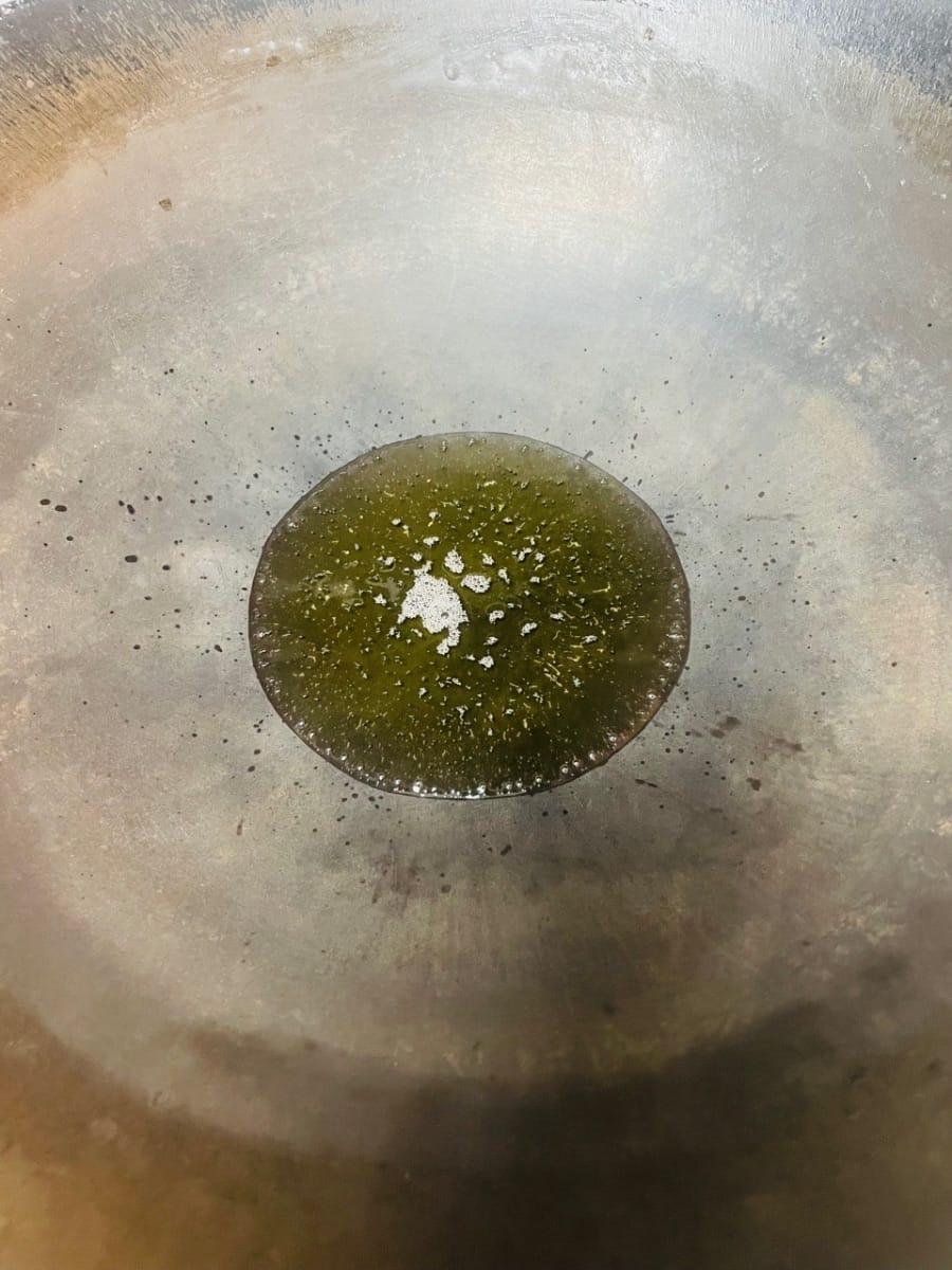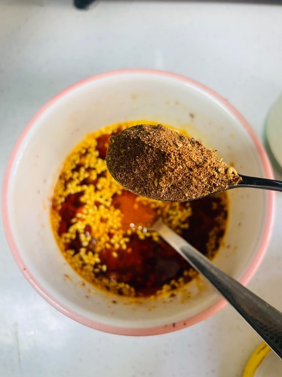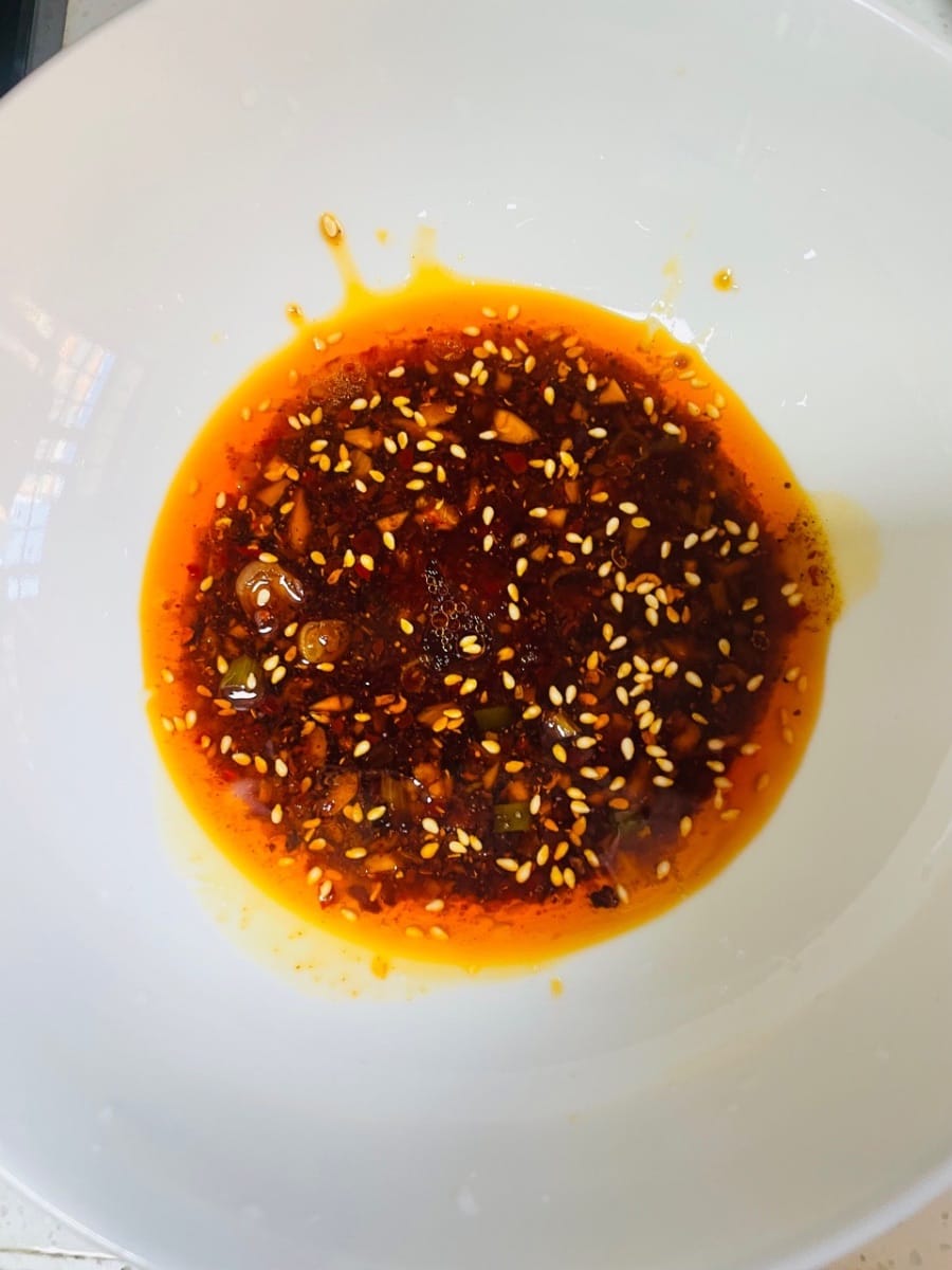 - Versate abbondante olio in una padella e fatelo scaldare. Quando sentite un rumore sfrigolante, versatelo sul peperoncino in polvere e mescolate bene.